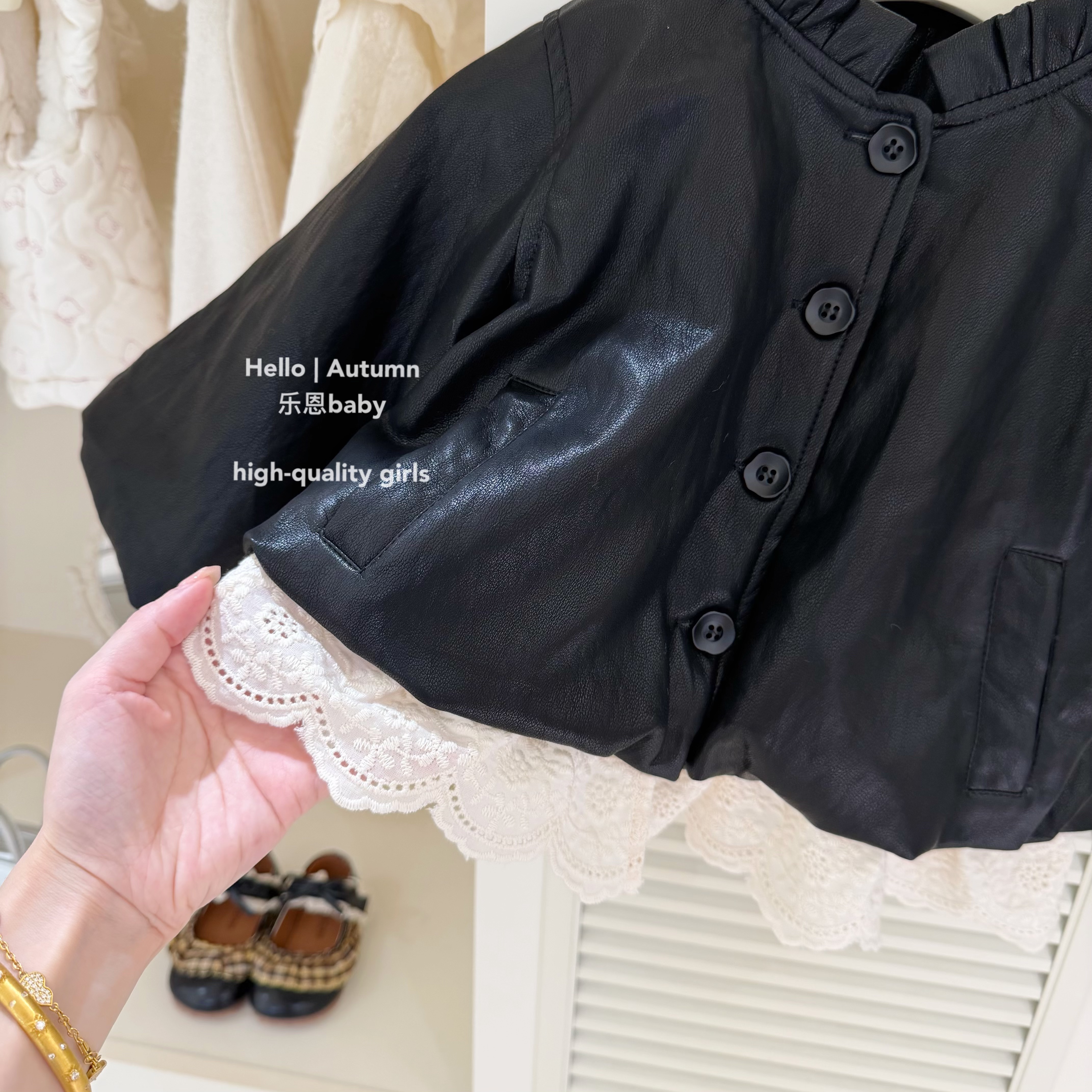 【乐恩童装】原创设计秋冬女童蕾丝拼接加绒皮衣韩版洋气棉服外套