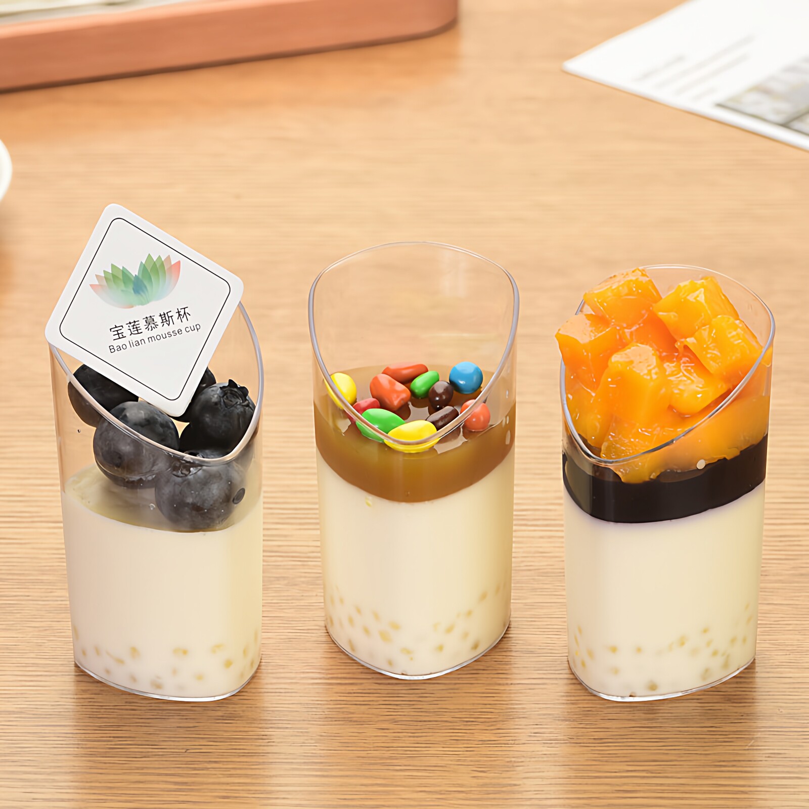 斜口慕斯杯甜品台一次性加厚硬塑料杯布丁杯含贴纸布丁奶冻杯50只
