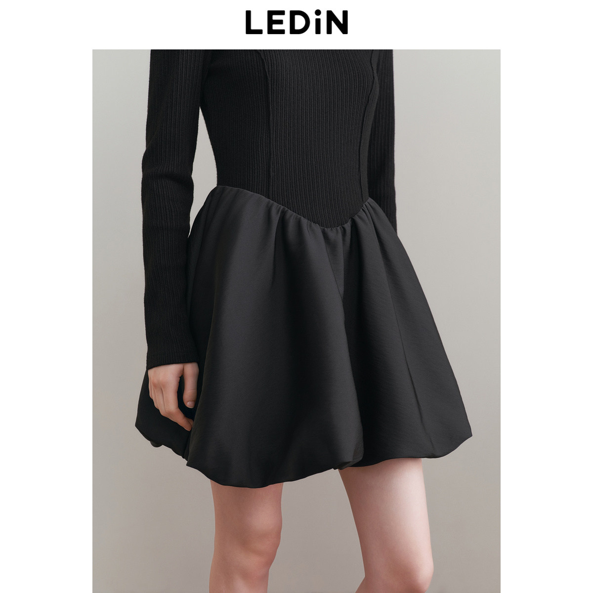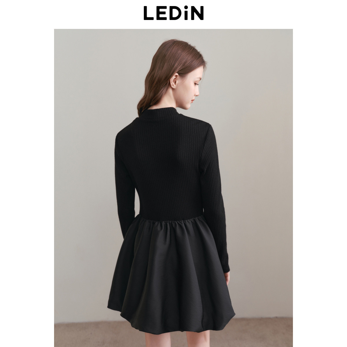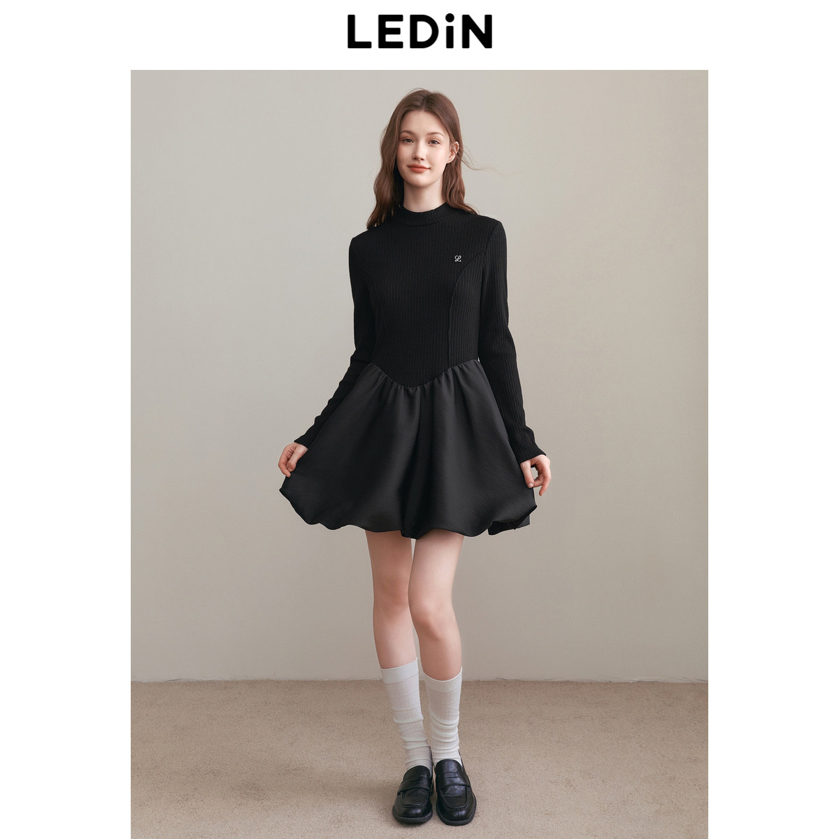 乐町气质立领针梭拼接连衣裙25年春新款小黑裙显高显瘦甜美花苞裙