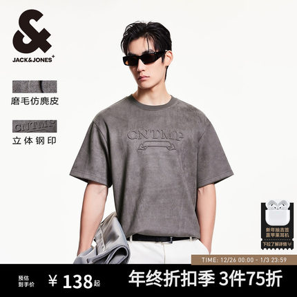 【仿麂皮】杰克琼斯男装2025年秋季新款宽松男士短袖T恤立体钢印
