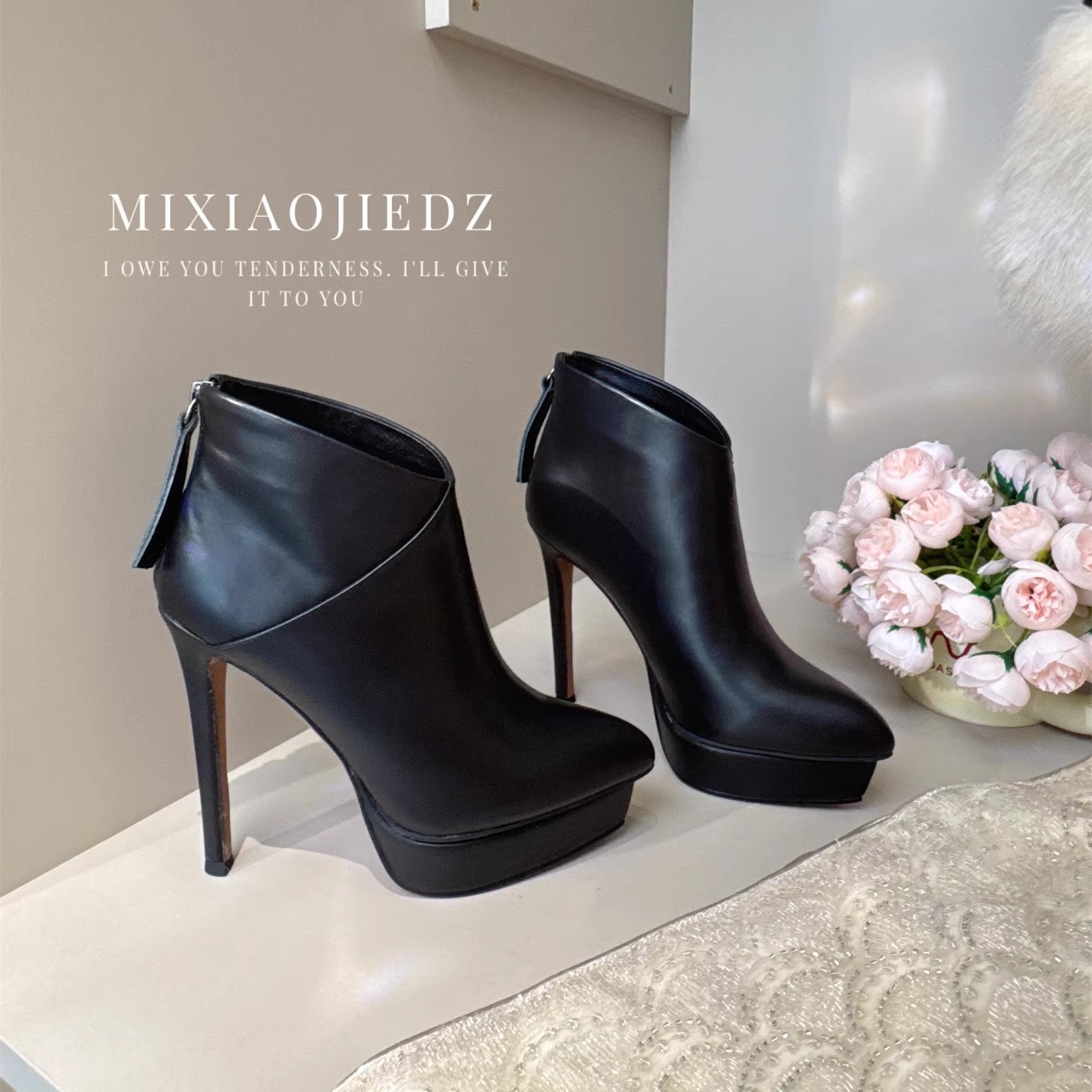 13cm新款气质高跟短靴尖头时装靴小个子不累脚防水台真皮百搭裸靴