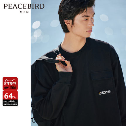 【重磅】太平鸟男装 口袋长袖t恤男时尚潮流黑色工装打底衫上衣男