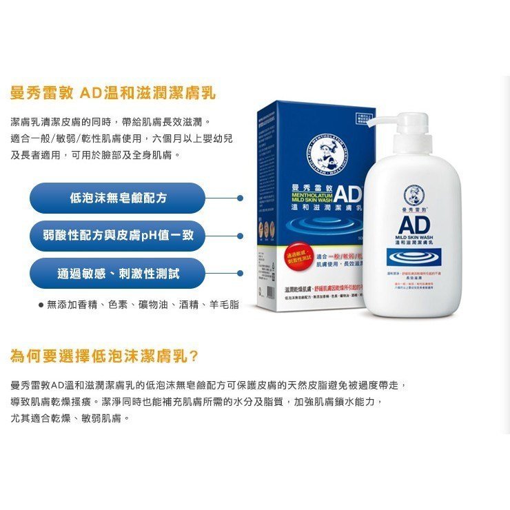 香港版曼秀雷敦AD安肤康温和洁肤乳舒缓肌肤干燥痕痒低泡沐浴露