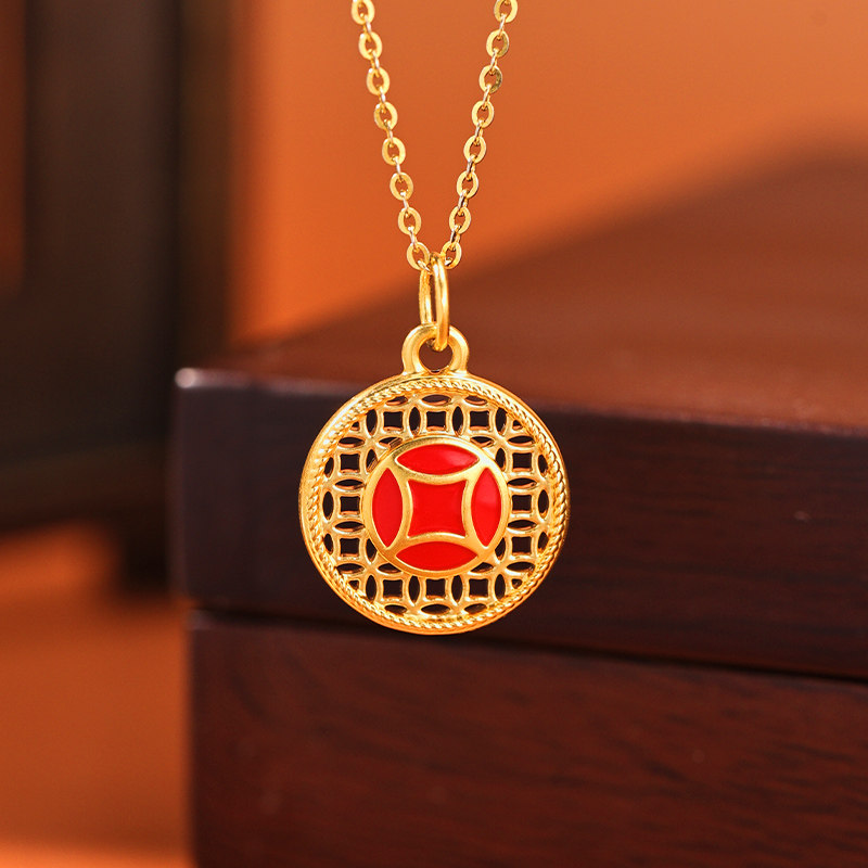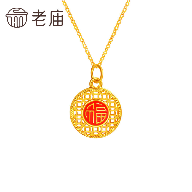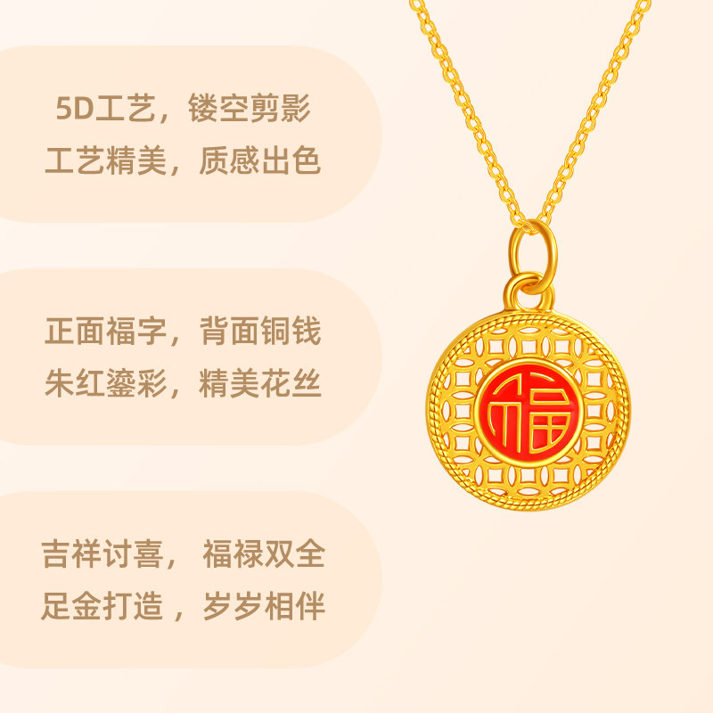 老庙黄金足金鎏彩铜钱福字牌吊坠挂坠5D工艺镂空花丝福禄满满官方