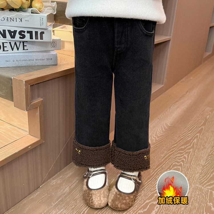 女童加绒牛仔裤秋冬季2025新款儿童洋气加厚直筒裤女宝宝冬装裤子