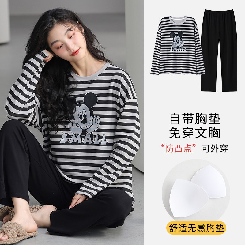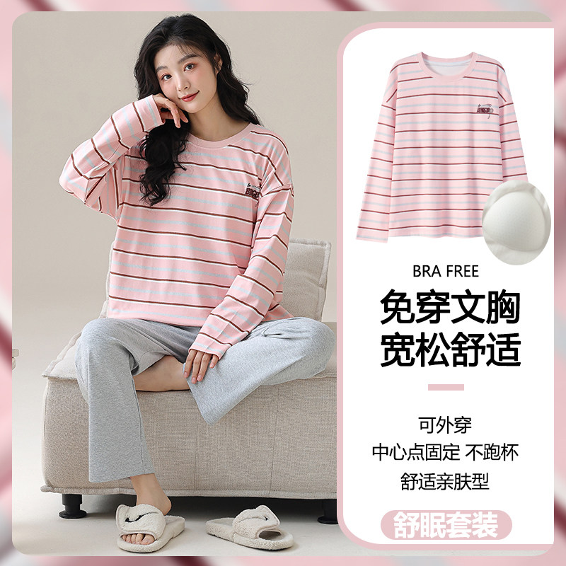纯棉长袖睡衣女2025新款春秋季带胸垫一体高级感大码冬家居服套装