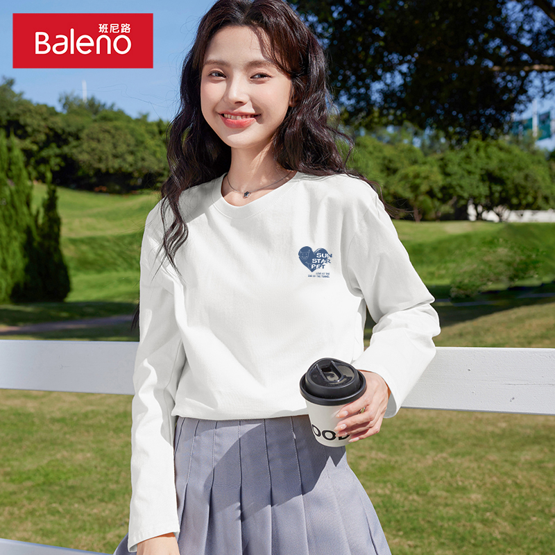 班尼路蓝色纯棉长袖t恤女春秋季2025新款爱心印花宽松内搭打底衫H