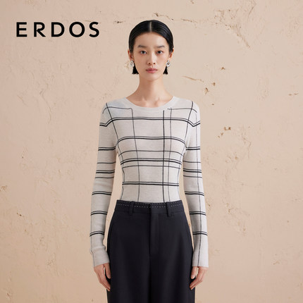 【精纺羊绒】ERDOS圆领抽条修身T恤女秋薄款针织套衫内搭