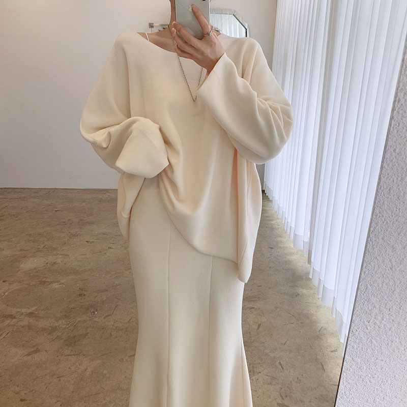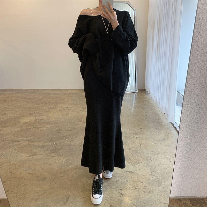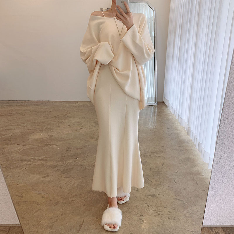 韩国chic秋季休闲慵懒风露肩宽松卫衣+高腰鱼尾边半身裙长裙套装