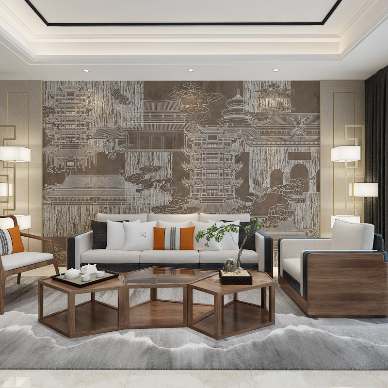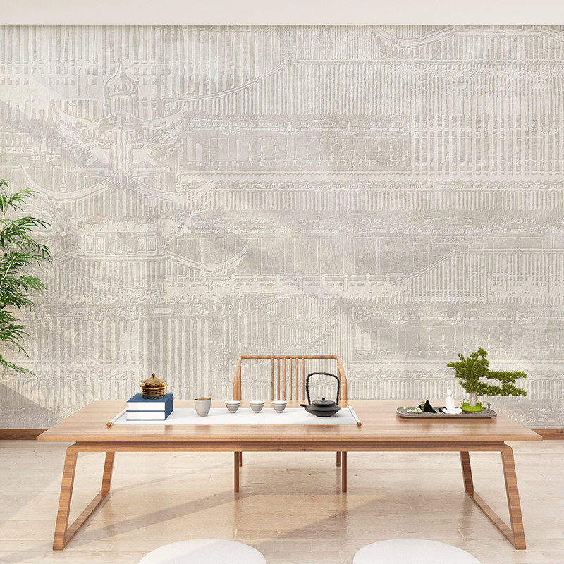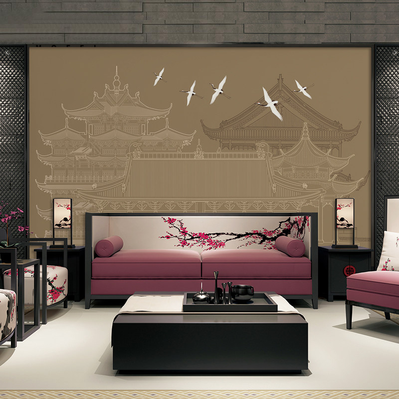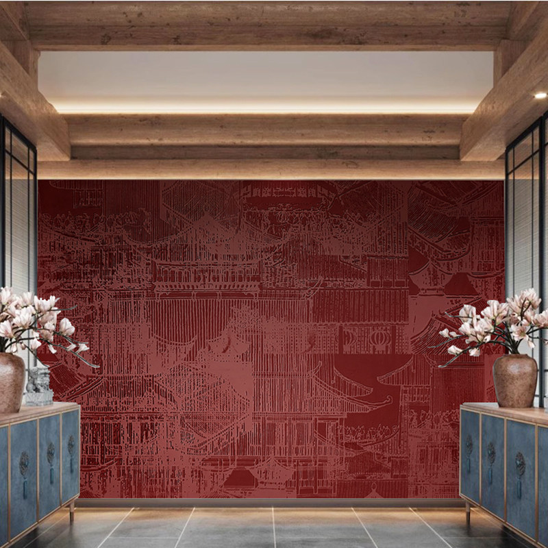 中式复古餐厅包厢壁纸阁楼山水背景墙纸壁布饭店包间装修定制壁画