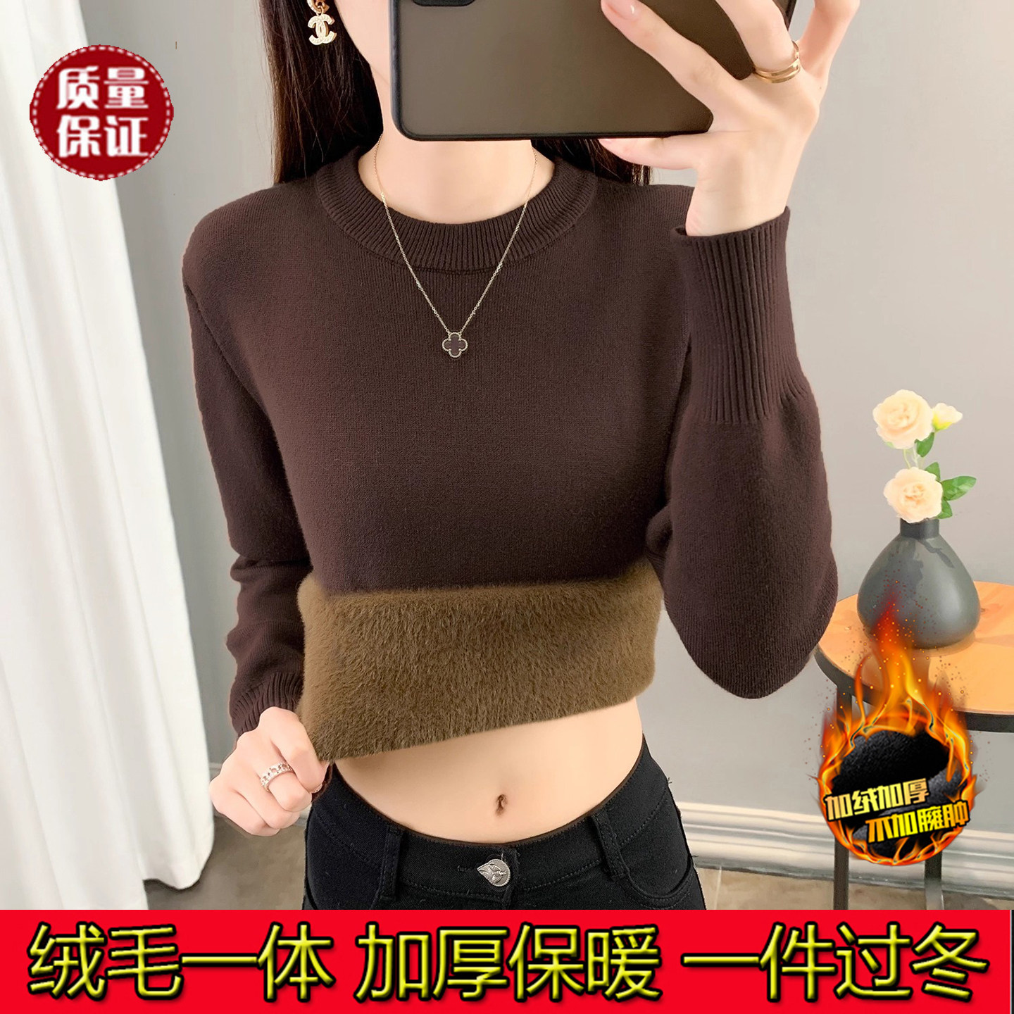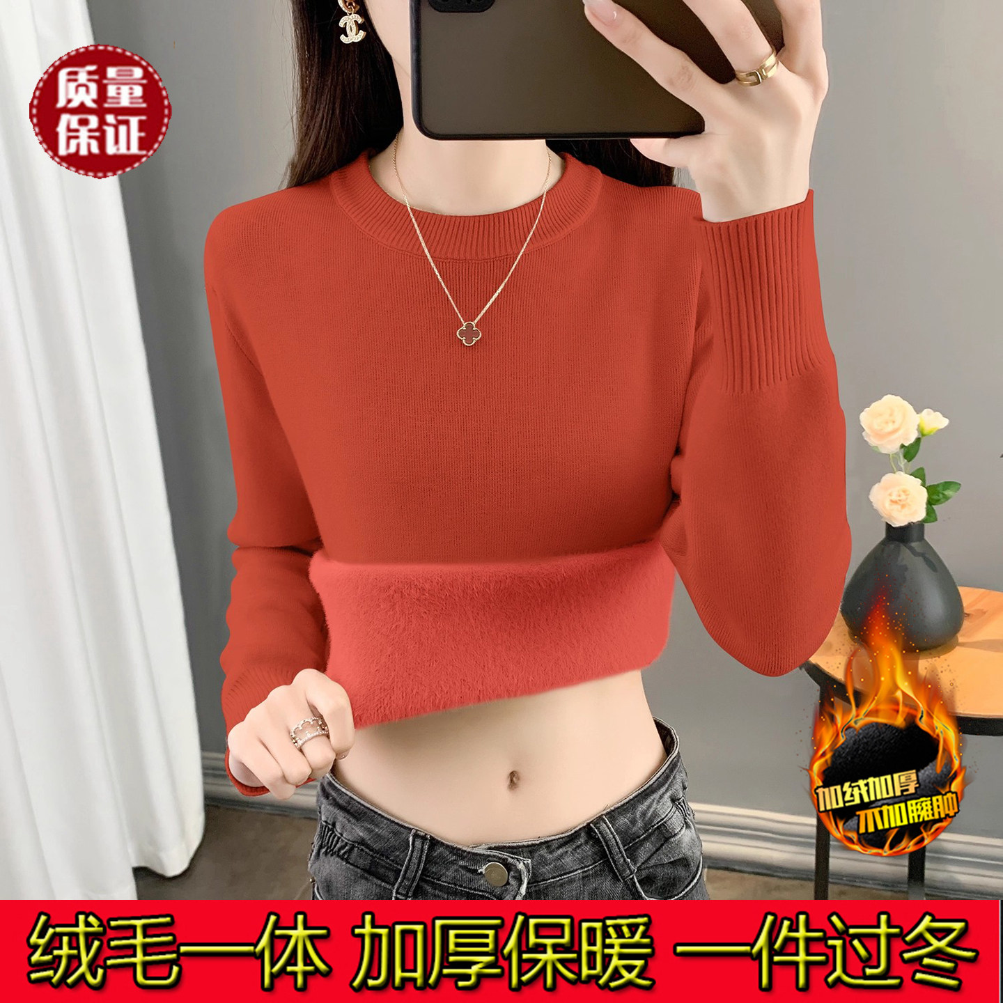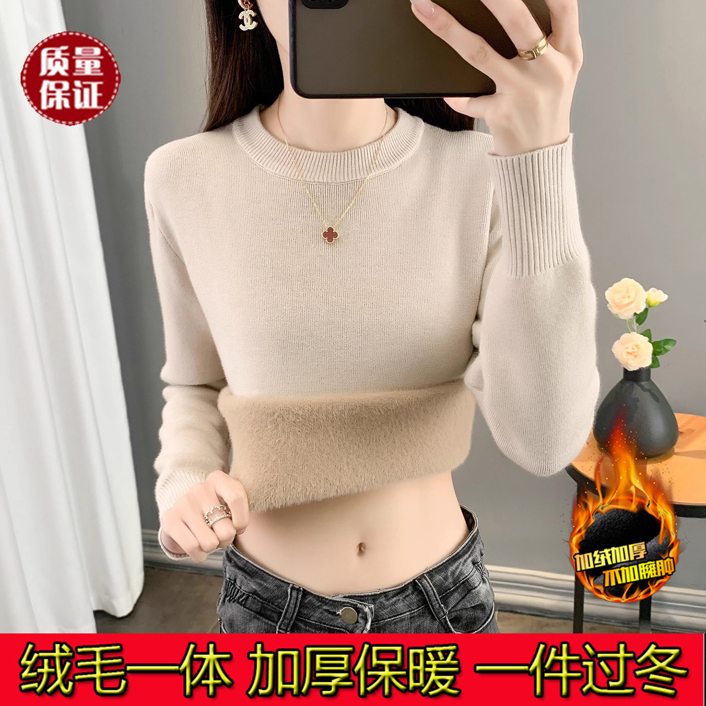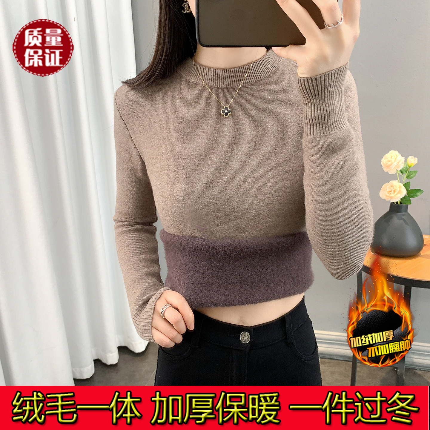鄂尔多斯市一体绒毛衣女加绒加厚圆领羊毛衫内搭针织打底衫女上衣