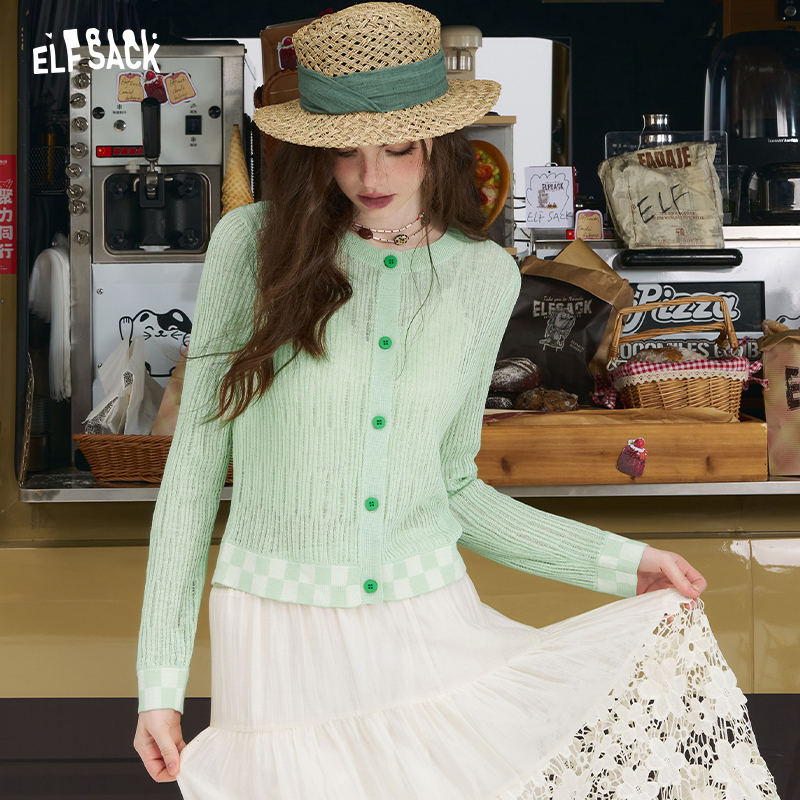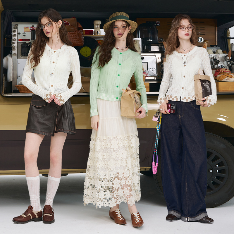 妖精的口袋白色棋盘格拼接针织衫女2025秋季新款修身薄款长袖开衫