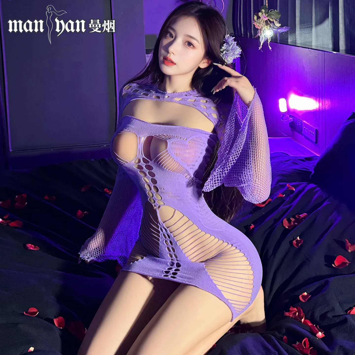 4967潮尚夜总会内衣女性感镂空长袖水袖网眼镂空包臀网衣连衣裙