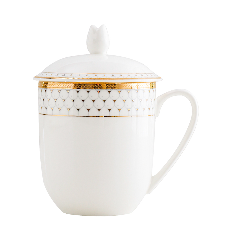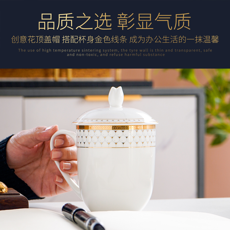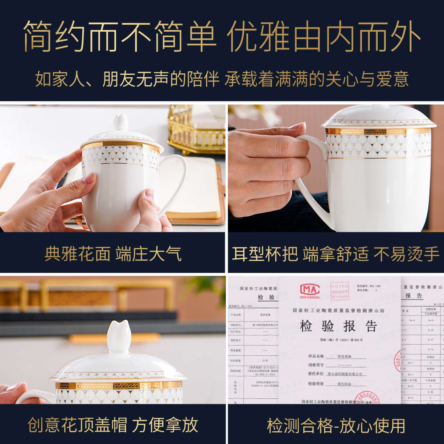 骨瓷办公杯带盖大容量会议杯陶瓷轻奢待客杯茶杯金边水杯定制logo