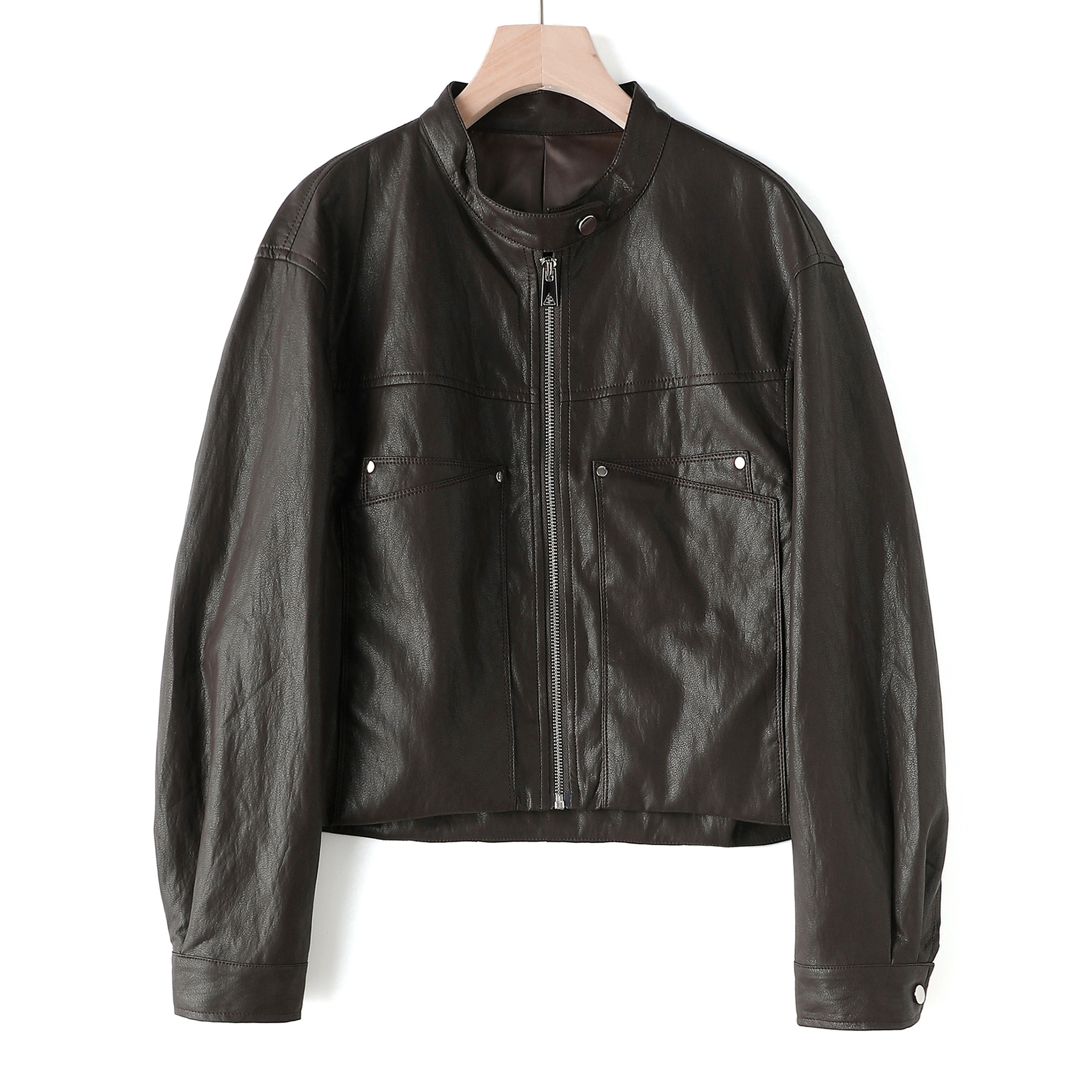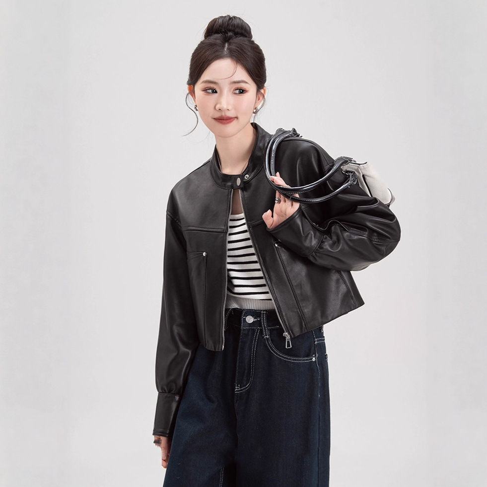 立领环保蛋白皮机车外套飒美休闲拉链短款皮衣女美式甜酷中性新款