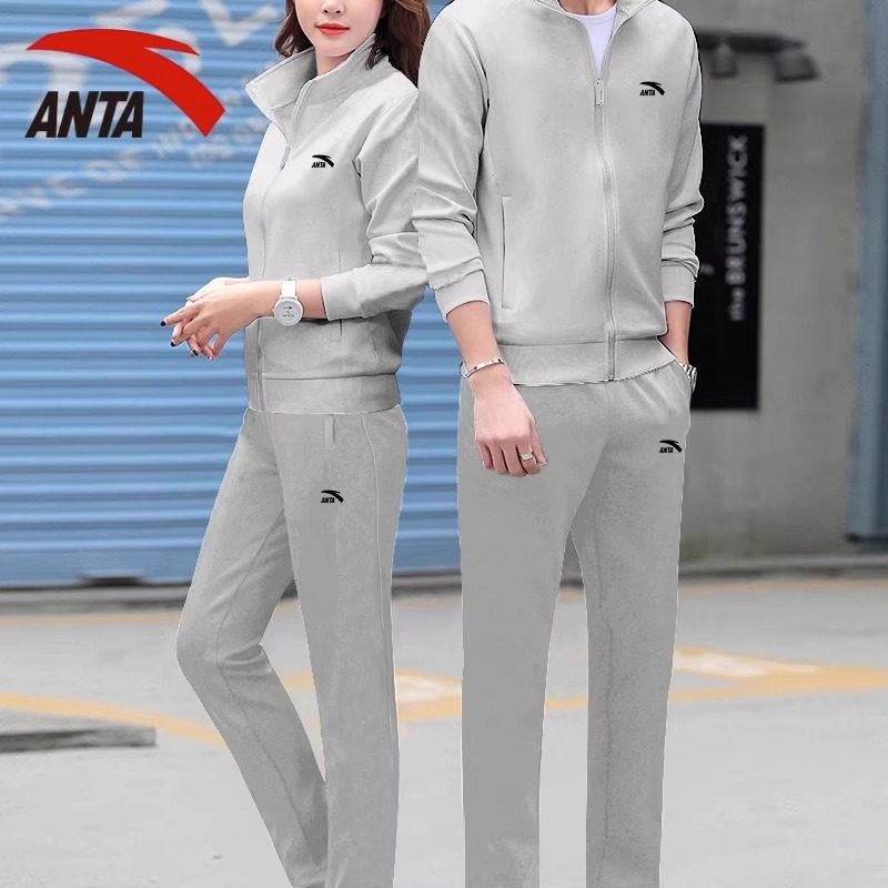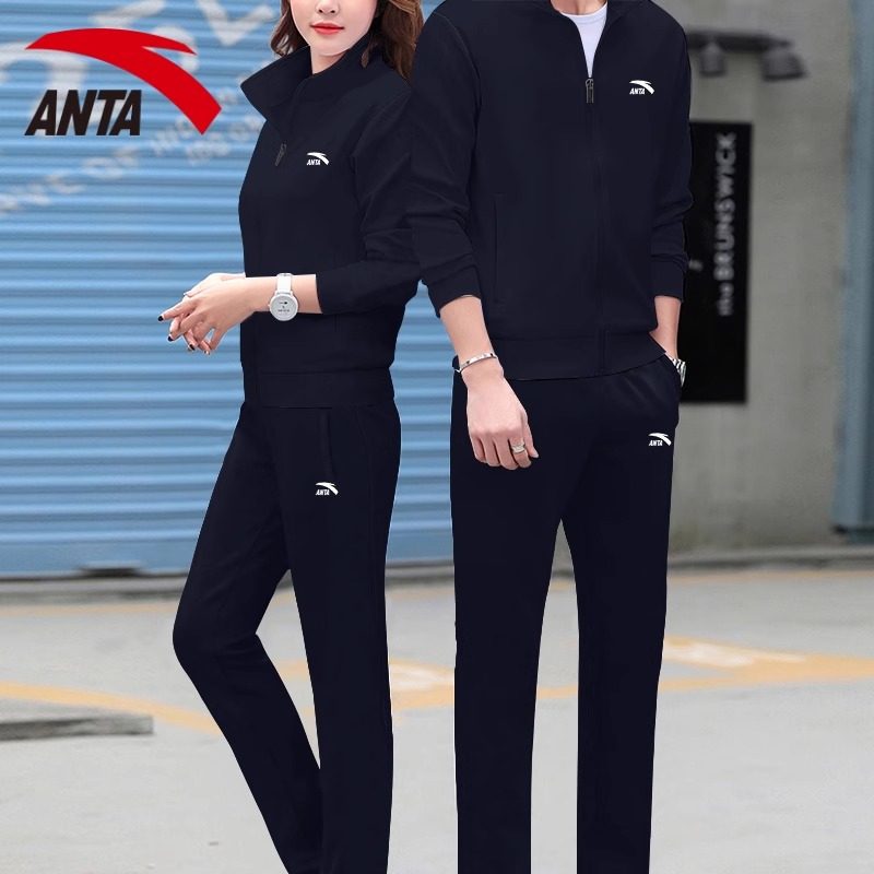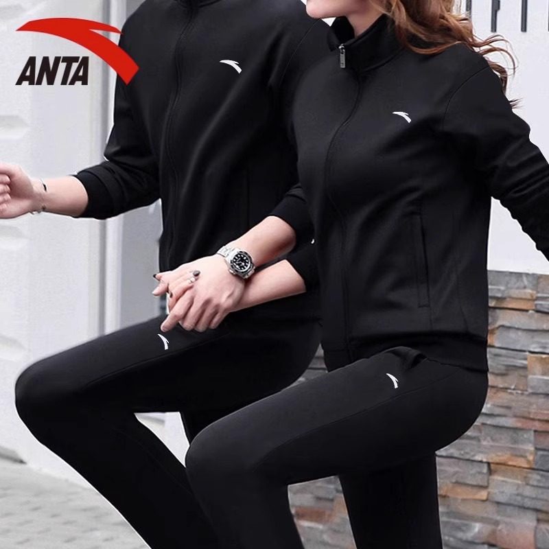 安踏情侣黑色长袖运动套装男女春秋宽松大码休闲跑步健身房运动服