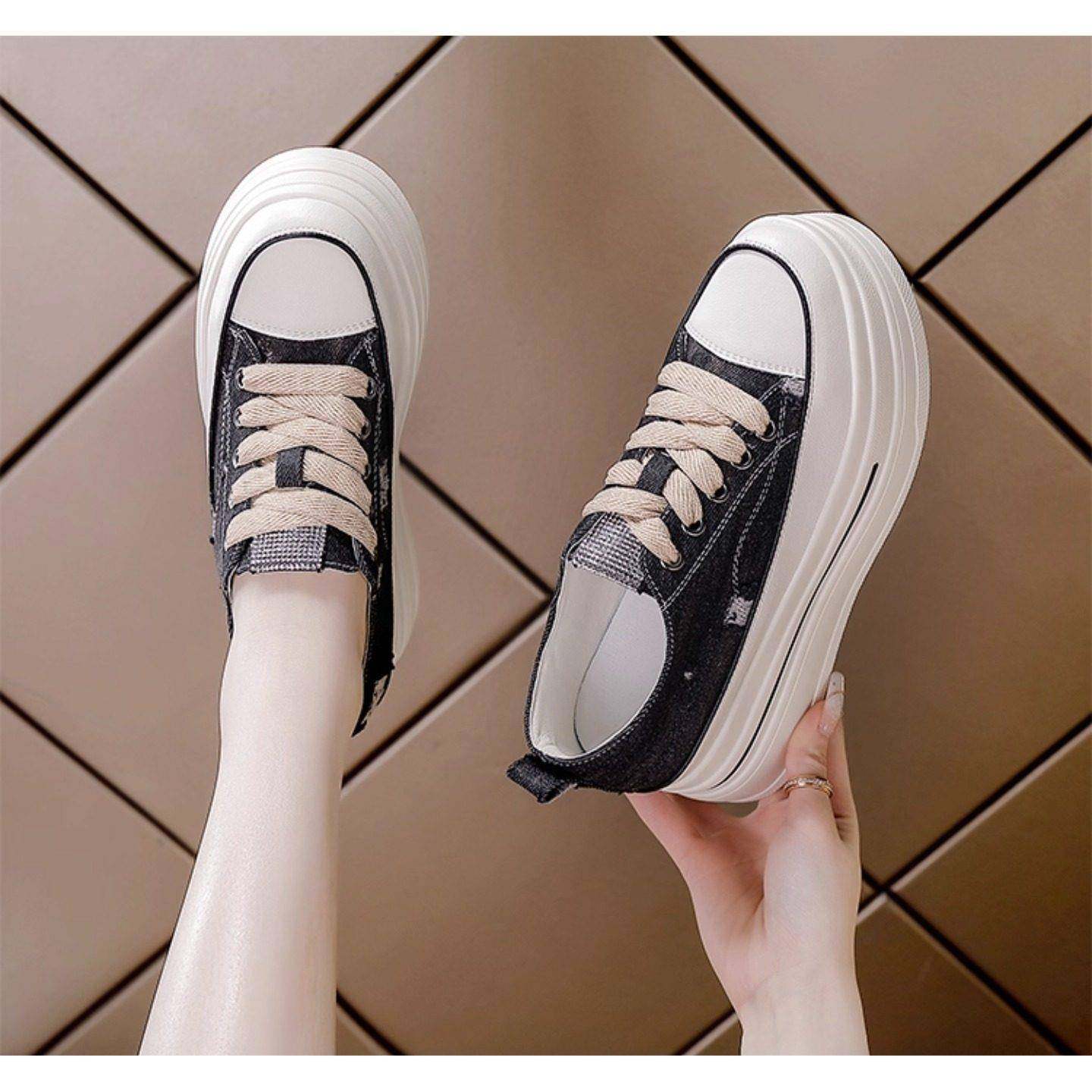 香港真皮帆布内增高小白鞋女6cm夏季百搭松糕鞋厚底运动休闲单鞋