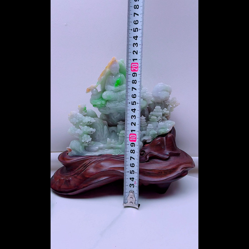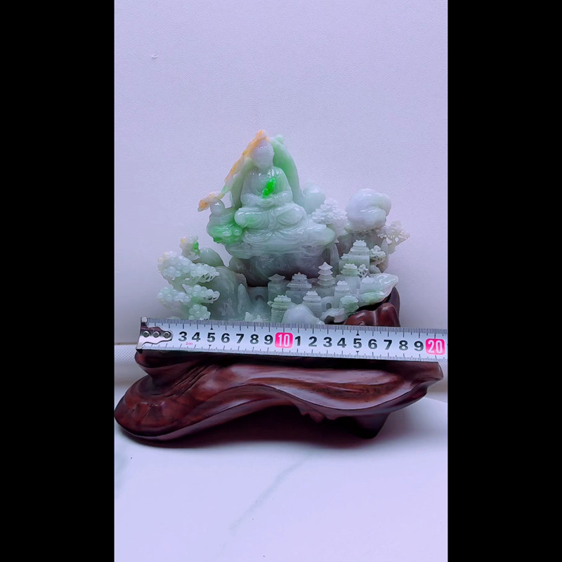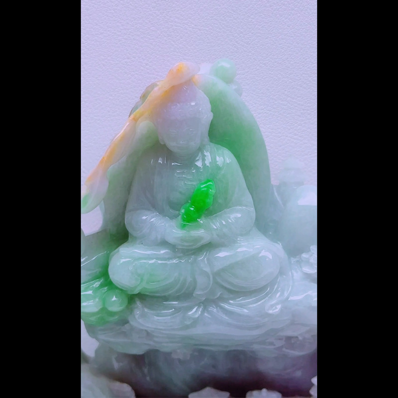 缅甸天然A货玉石翡翠孤品 精雕老坑双彩山水阿弥陀佛摆件