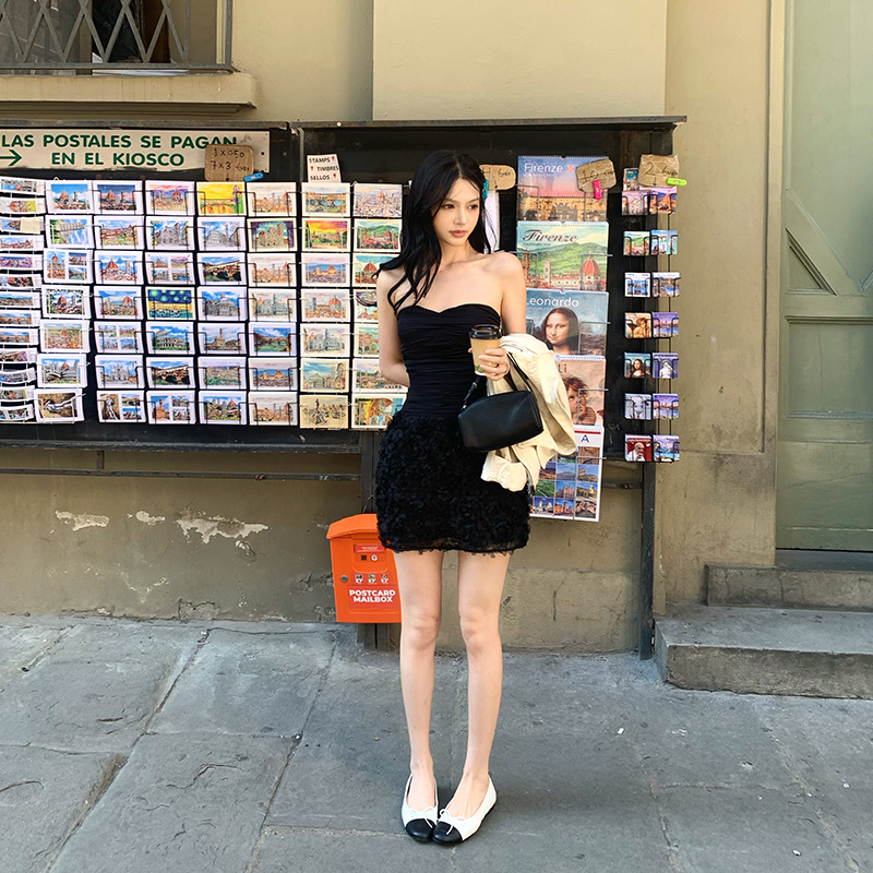 Lienni2025夏季新款浪漫收腰显瘦拼接玫瑰摆天鹅压褶抹胸连衣裙女