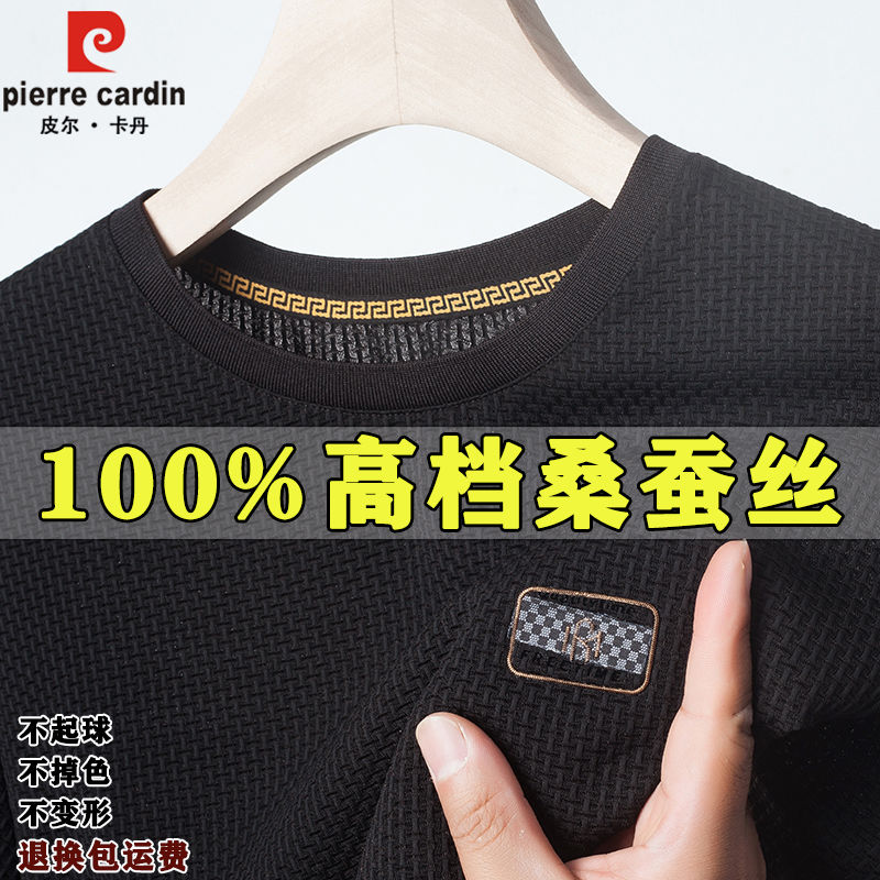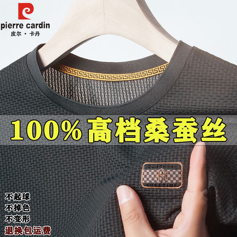 皮尔卡丹桑蚕丝夏季新款男士短袖t恤高档圆领休闲宽松纯色上衣男