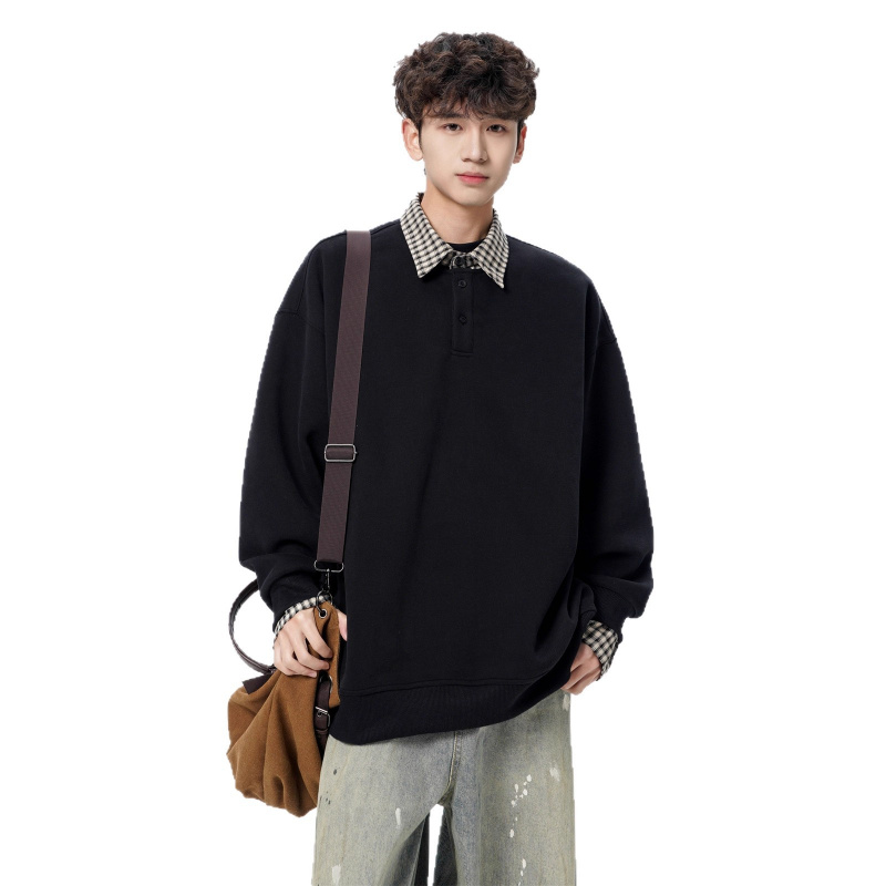 美式复古格子polo领卫衣男春秋新款宽松学院风情侣假两件长袖T恤