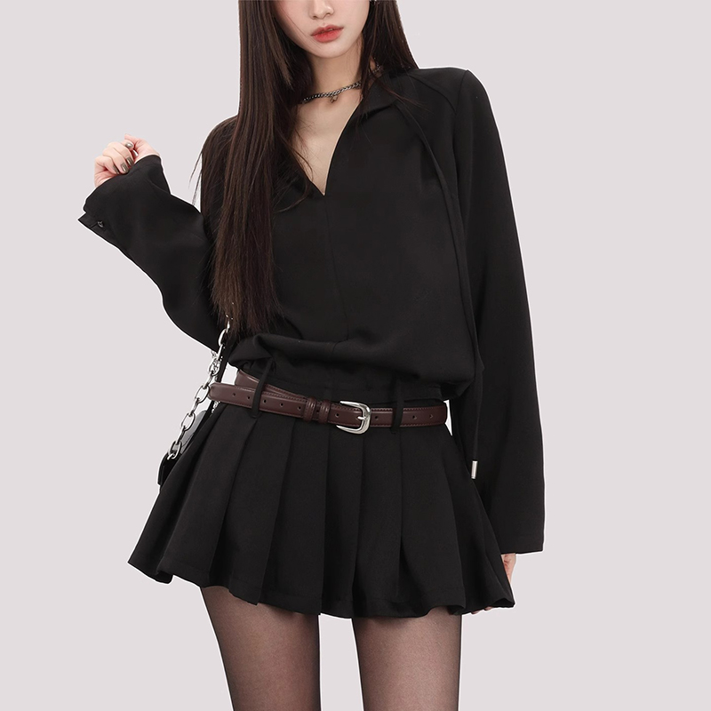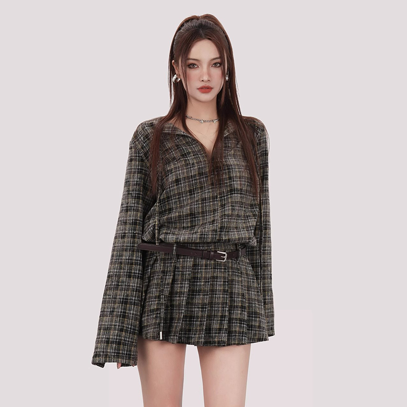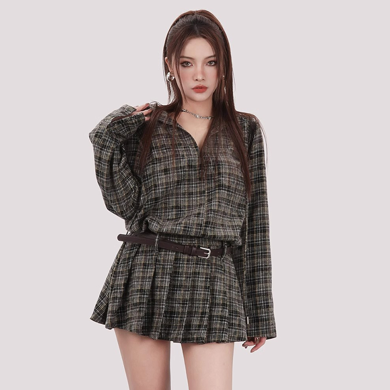 【送腰带】辣妹法式衬衫裙长袖格子春季连衣裙短裙女短款D0445