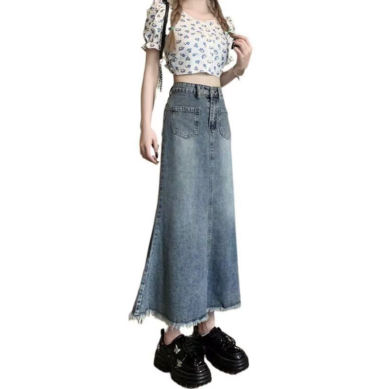 复古毛边牛仔鱼尾裙女夏季大码高腰显瘦梨形中长款a字半身KX