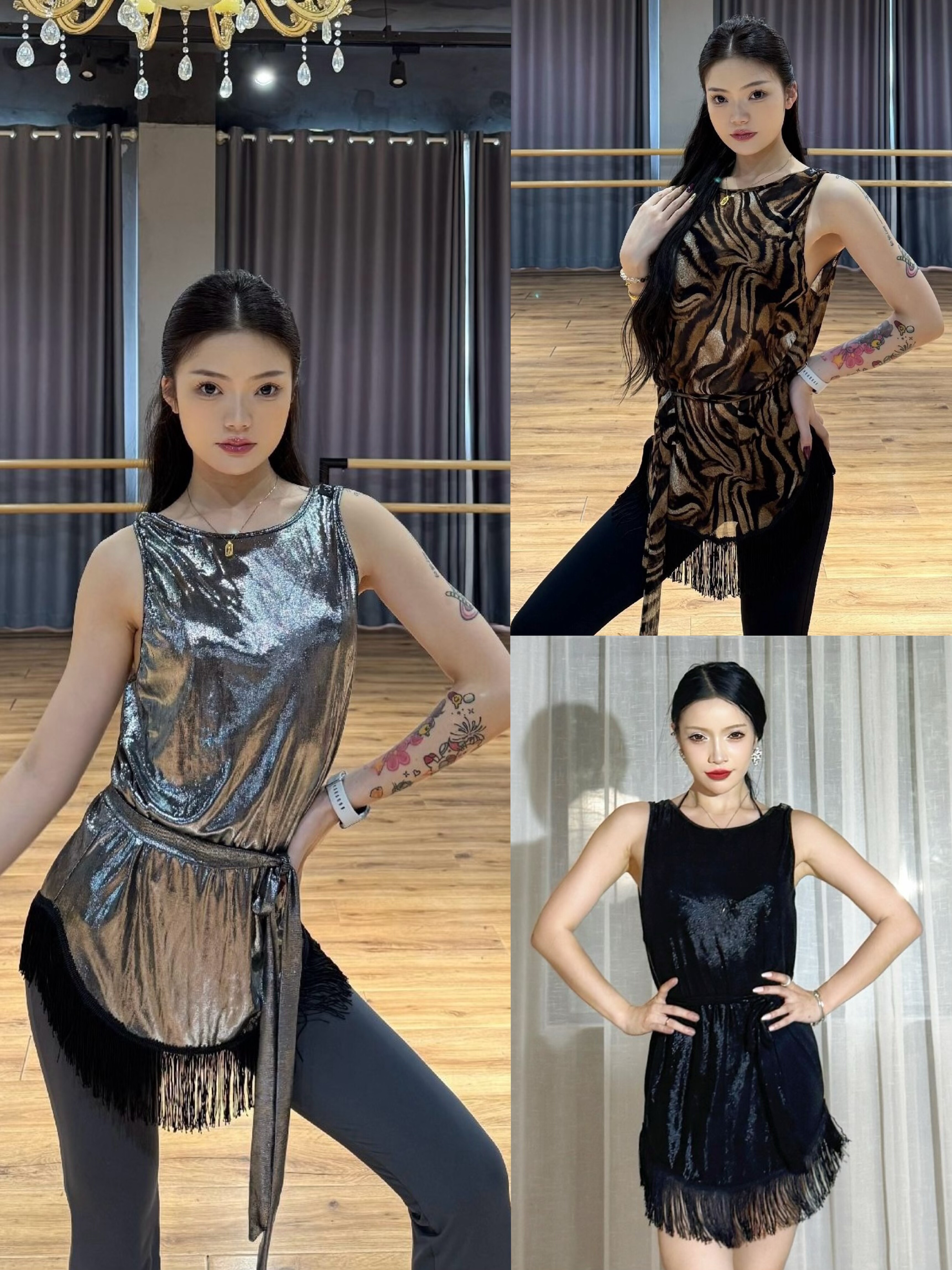 Alei拉丁舞服无袖罩衫露背上衣亮黑银色棕虎纹练舞教课艺考女成人