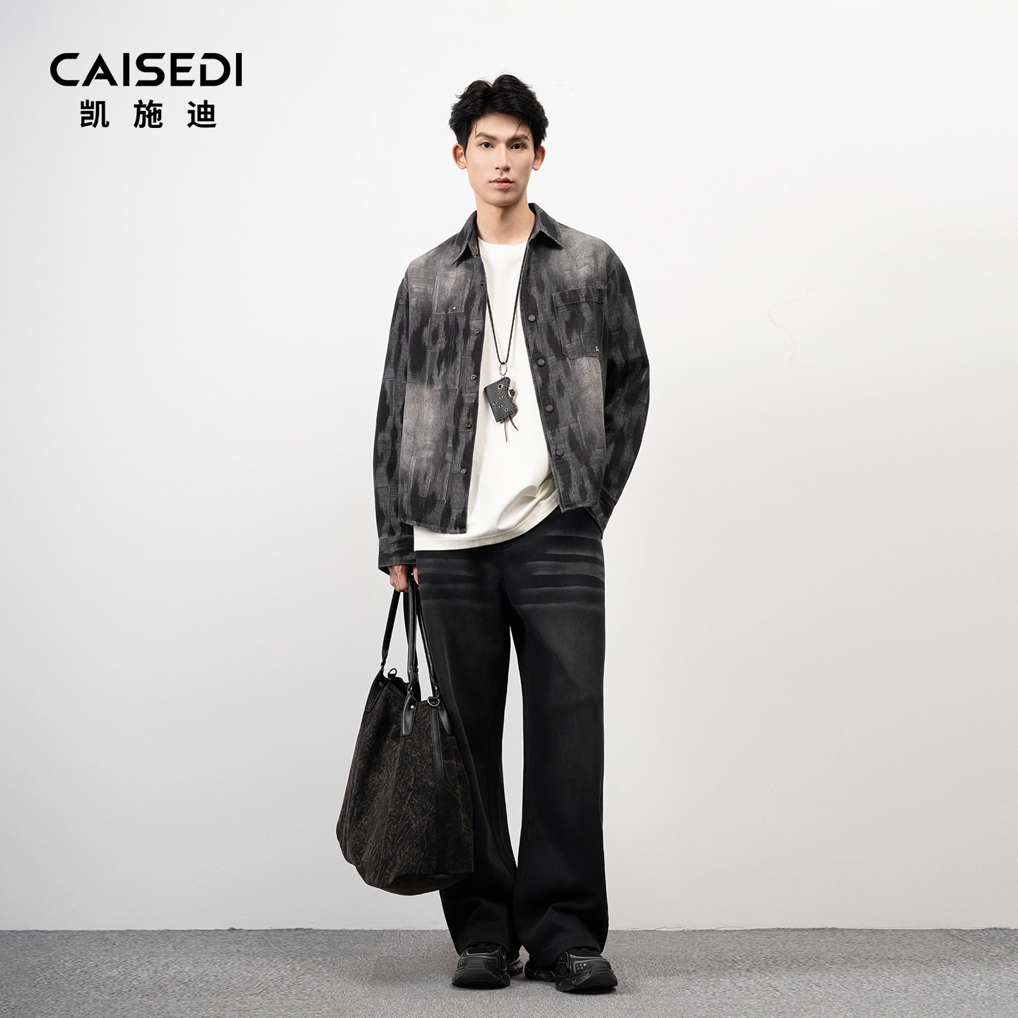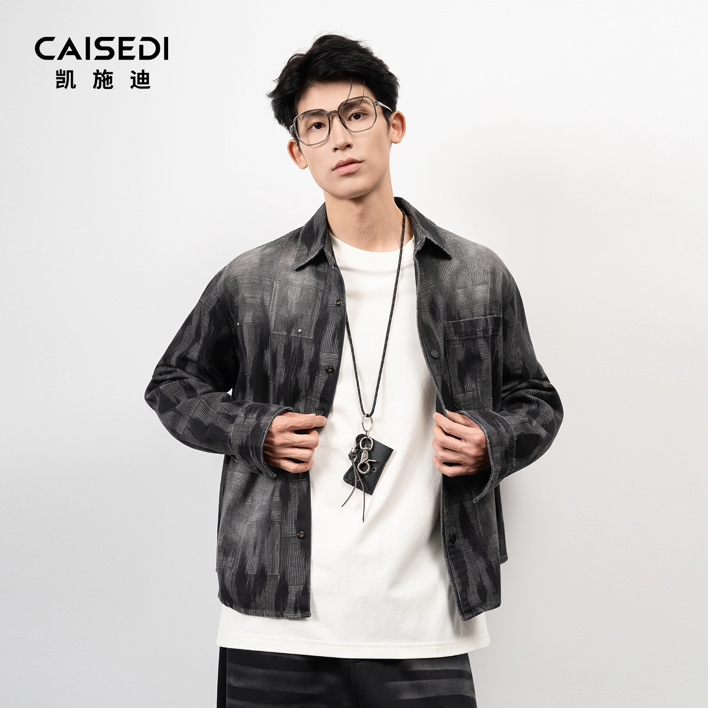 凯施迪牛仔衬衫夹克男秋冬新品潮牌复古做旧翻领外套宽松休闲衬衣