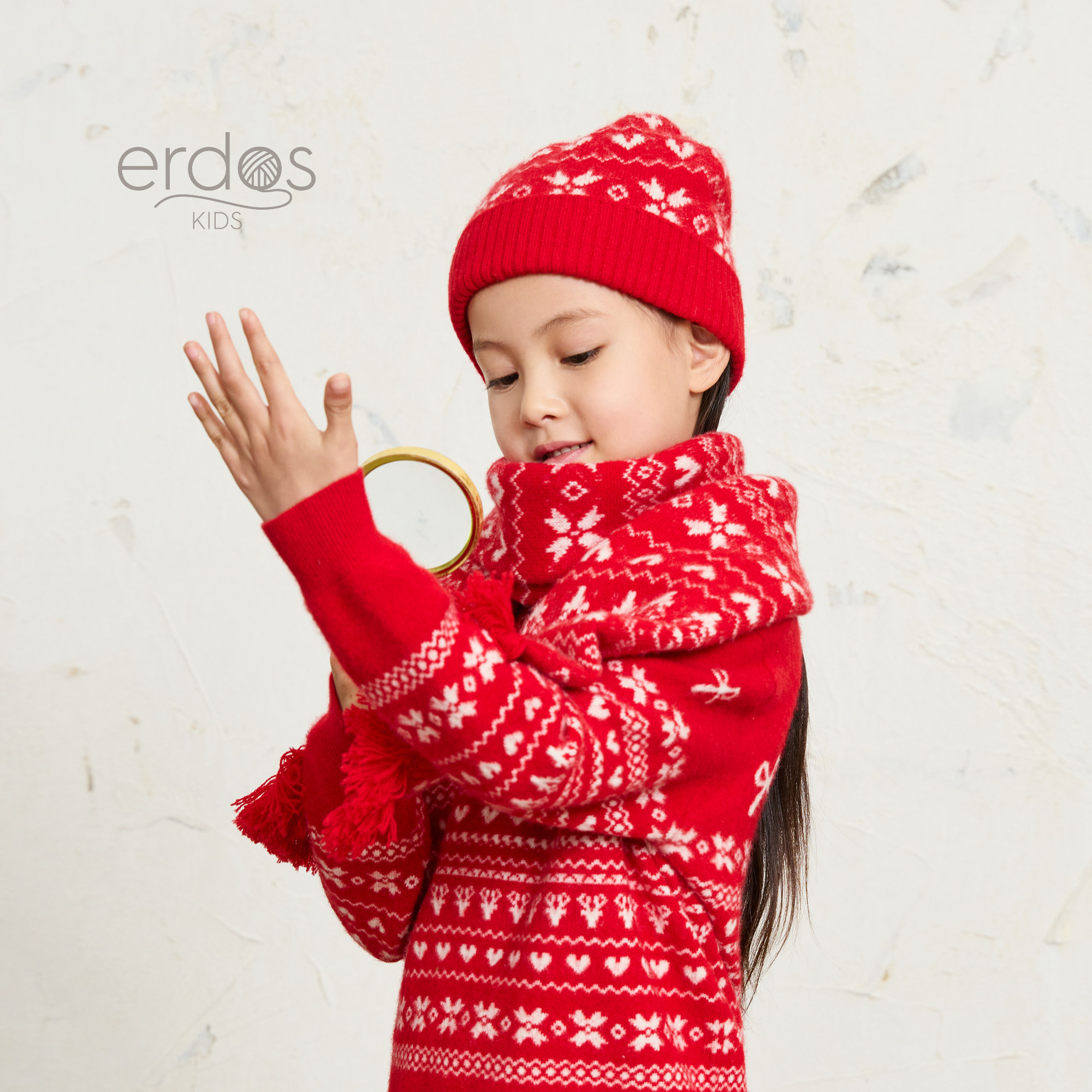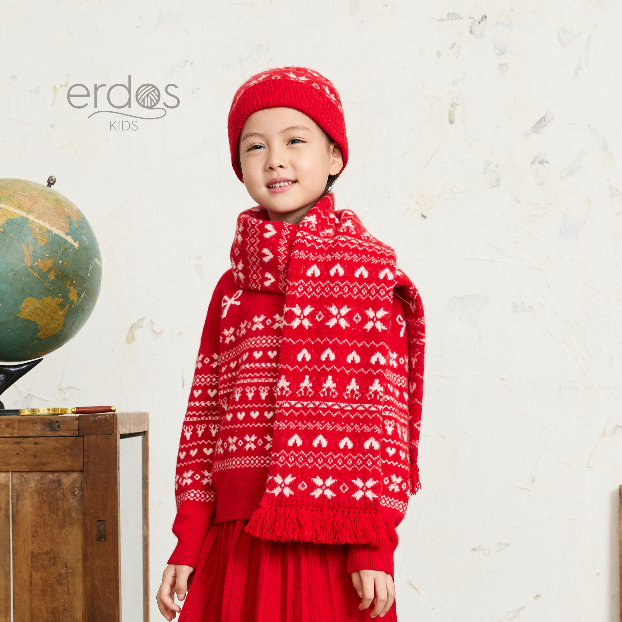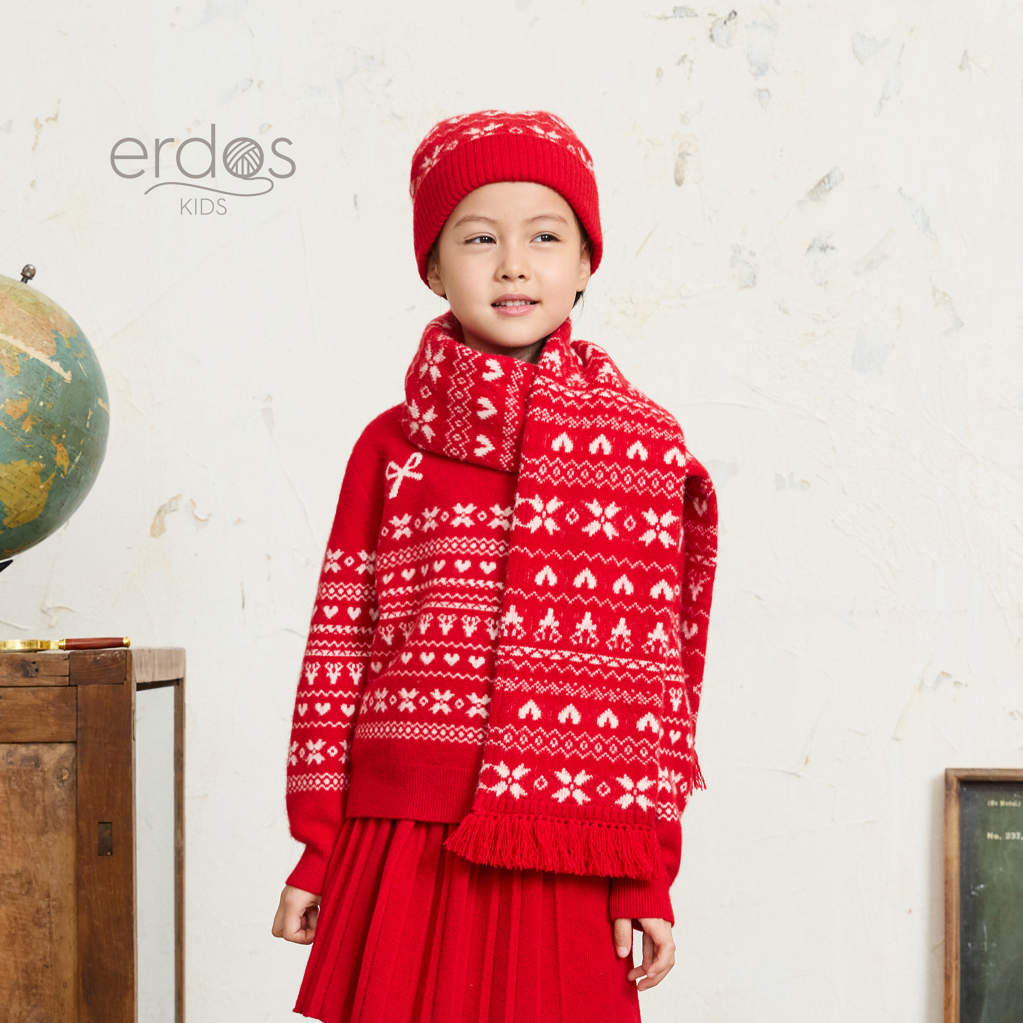 【100%山羊绒】erdosKIDS 鄂尔多斯童装新年红保暖帽子手套两件套