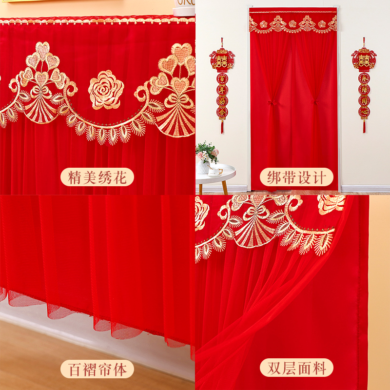 红色喜庆蕾丝防蚊门帘免打孔伸缩杆家用婚房隔断帘纱帘透光不透人
