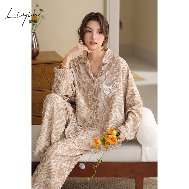 栗茵春秋季带bra泡泡绵女士长袖长裤睡衣可外出小众家居服套装