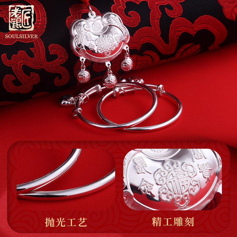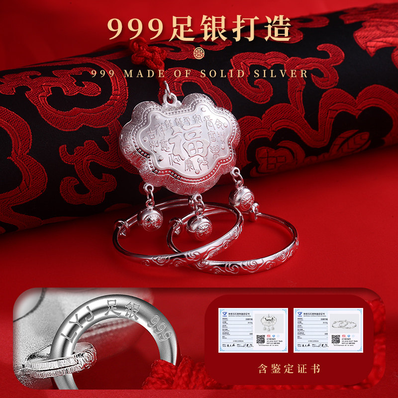 老银匠s999纯银婴幼儿长命锁纯银女宝宝银饰儿童节礼物新生银手镯