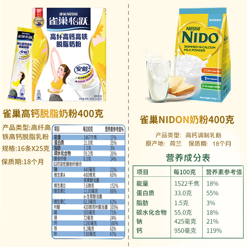 雀巢安骼奶粉正品脱脂高钙成年学生女士营养冲饮小条装袋装nido