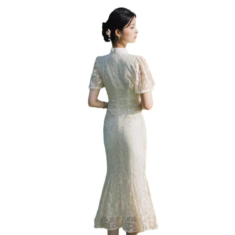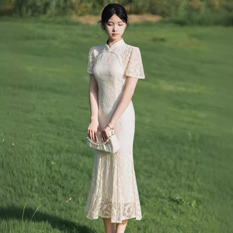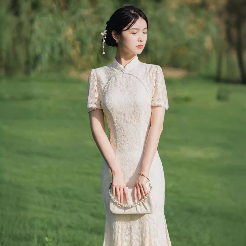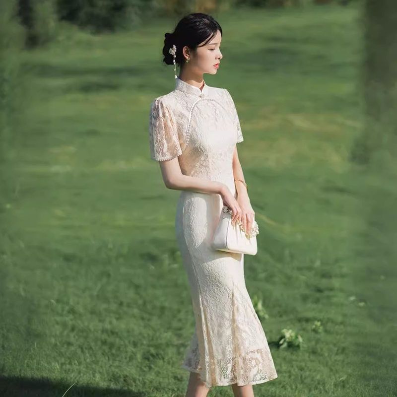 蕾丝鱼尾旗袍新款2024改良年轻款少女高贵小个子日常可穿连衣裙夏