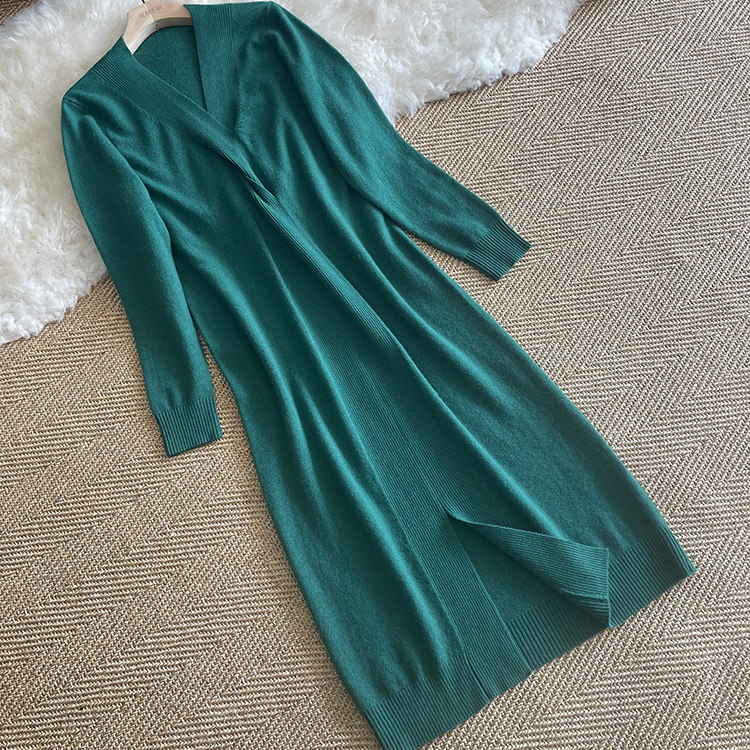 秋冬新款女连衣裙修身羊绒长裙包臀毛衣裙开叉款针织扭纹打底过膝