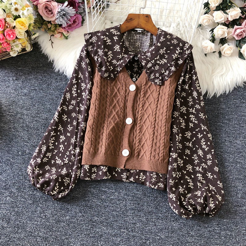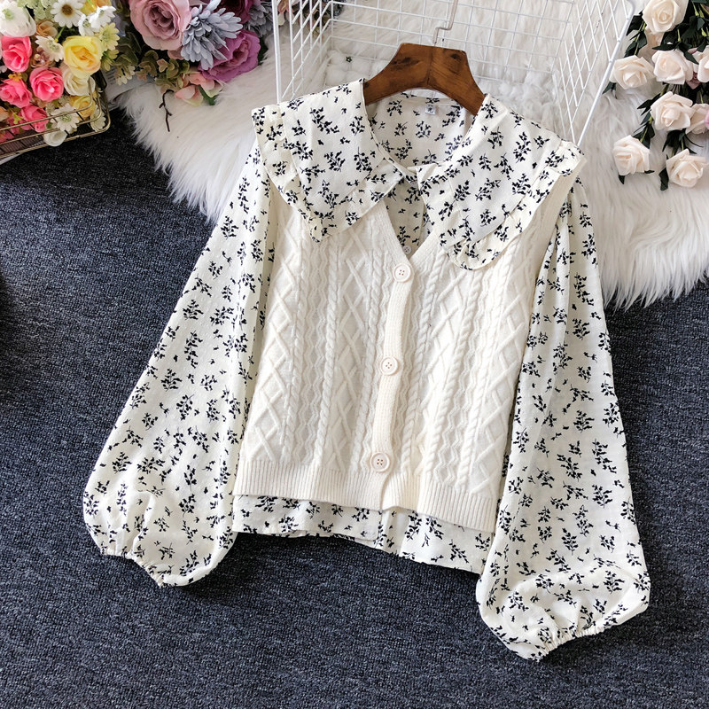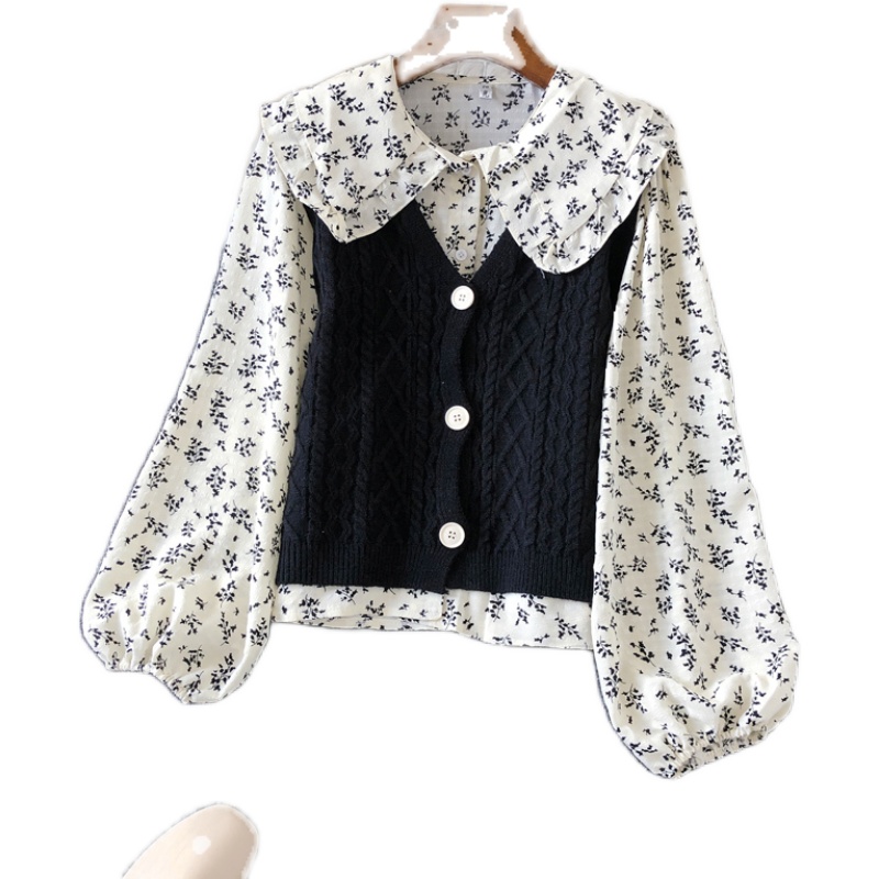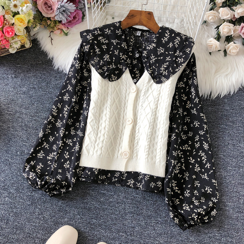 2023春季港风套装女复古chic娃娃领碎花衬衫+针织马甲气质两件套