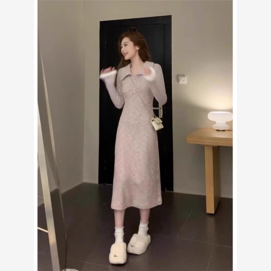 粉紫色Polo领皱褶设计感收腰显瘦连衣裙女秋季内搭长袖毛边打底裙