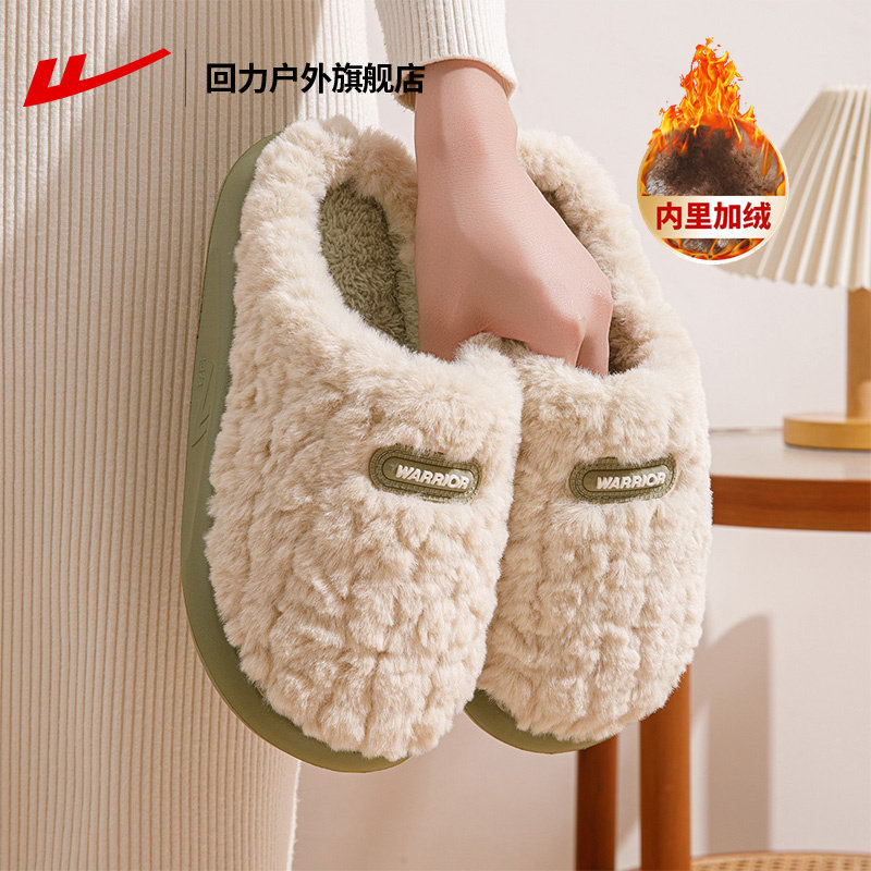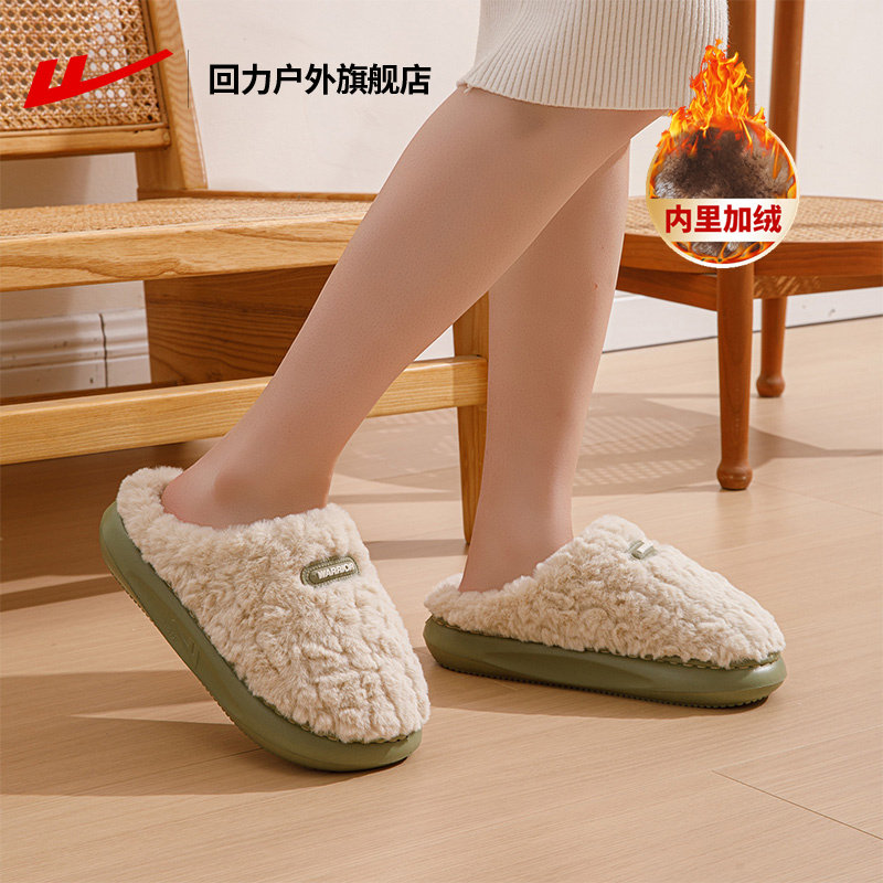回力女鞋室内家居毛绒棉拖鞋冬季新款加绒加厚保暖绿色厚底棉鞋女