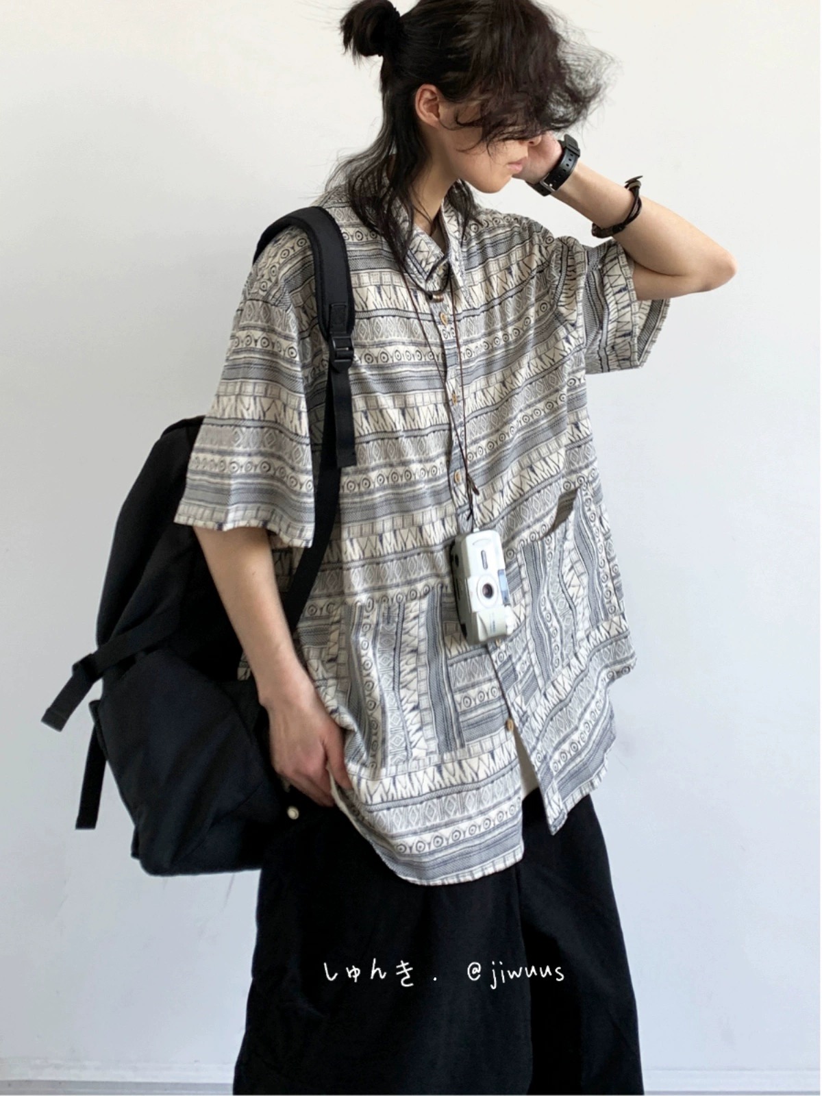 日系新款民族风满印短袖衬衫男女夏季宽松复古慵懒风个性薄款衬衣