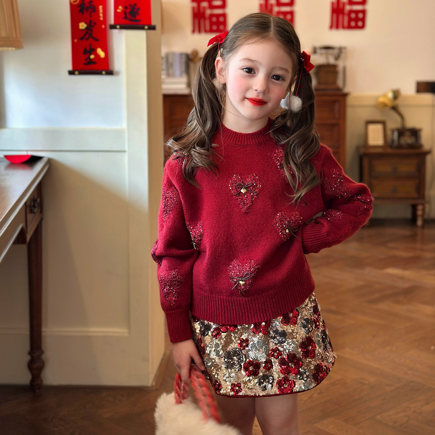 栀了成长记女童装时髦红色爱心毛衣2025冬季儿童新年百搭针织上衣