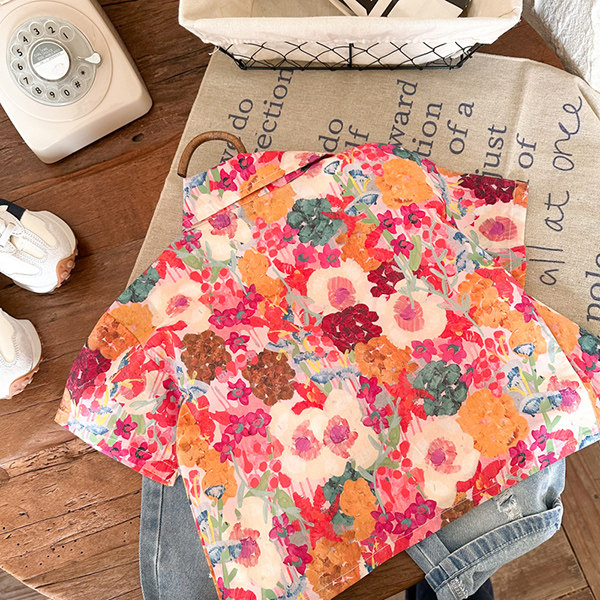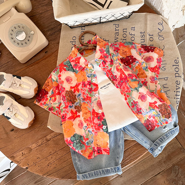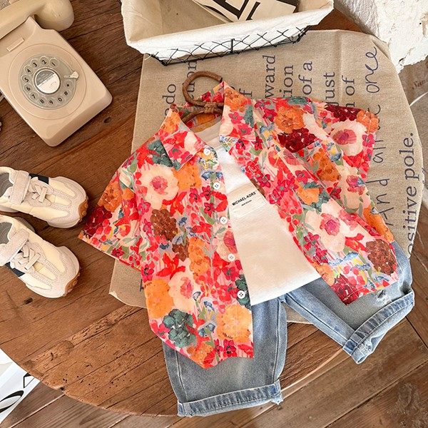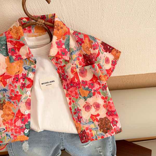 儿童花衬衫男童夏季爆款小童休闲纯棉上衣网红宝宝沙滩风衬衣短袖