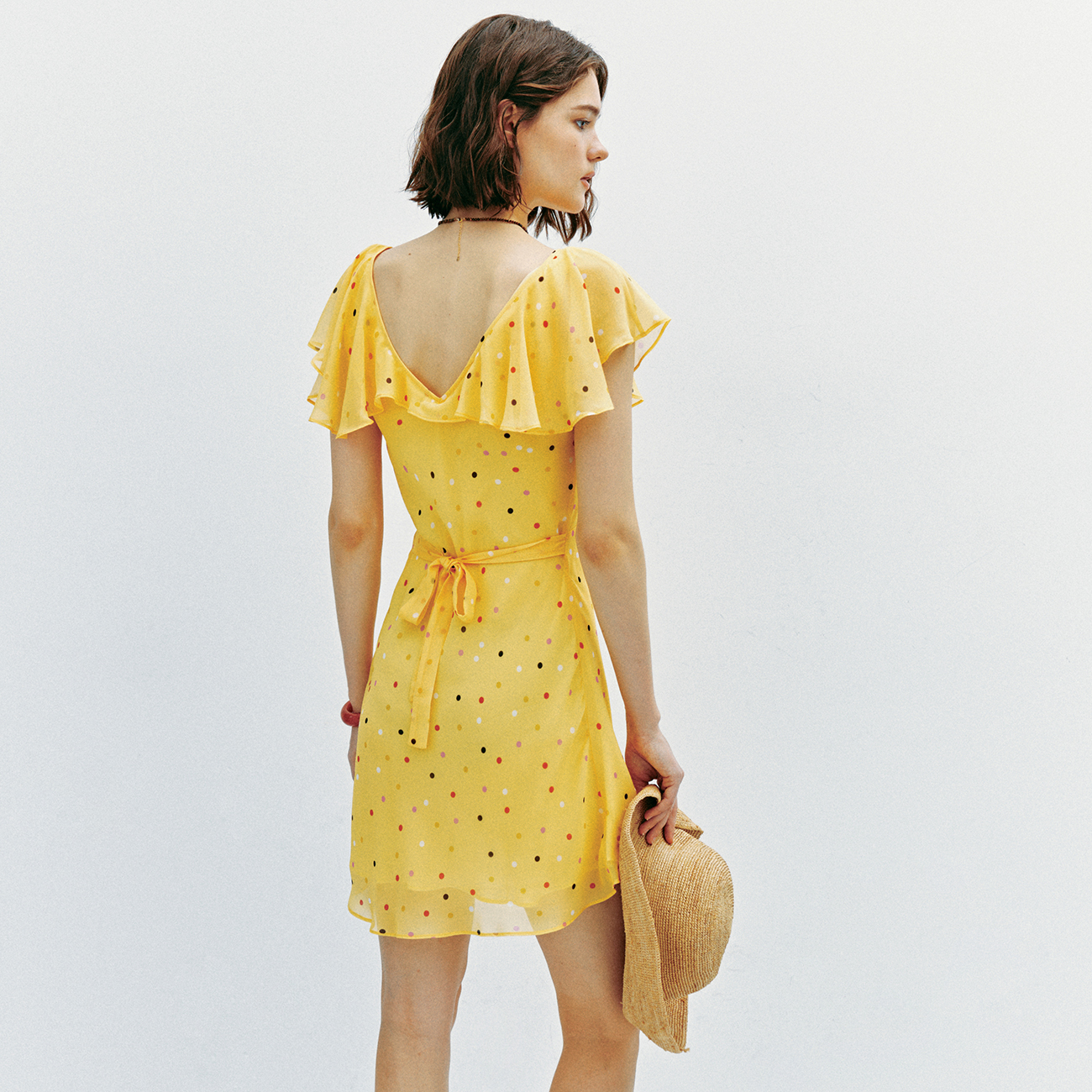 【夏日柠檬】桑蚕丝乔其纱 复古波点荷叶边领斜裁收腰A字连衣裙