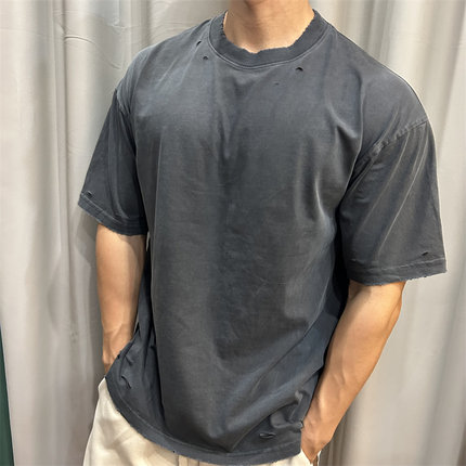 新品275g复古做旧割破坏洗水t恤