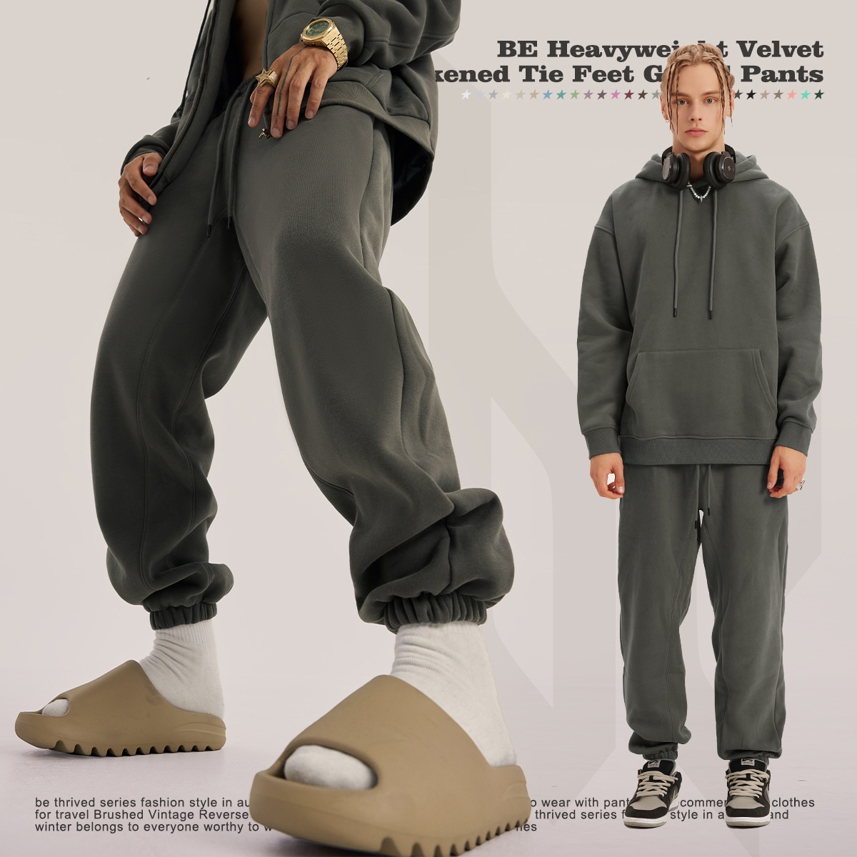 秋冬高街纯色休闲加绒卫裤美式潮牌hiphop束脚裤宽松百搭束脚裤男