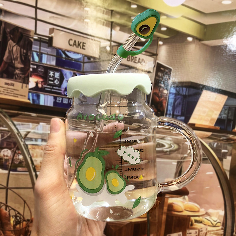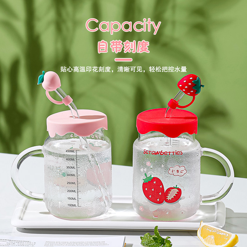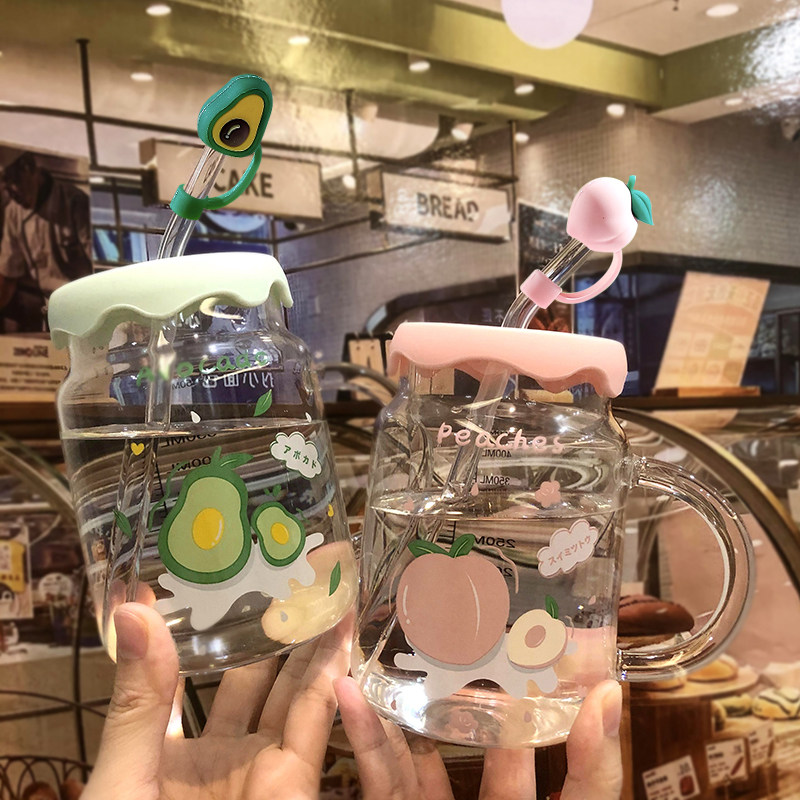 夏季ins高颜值马克杯水果玻璃吸管杯带盖水杯子家用办公室花茶杯