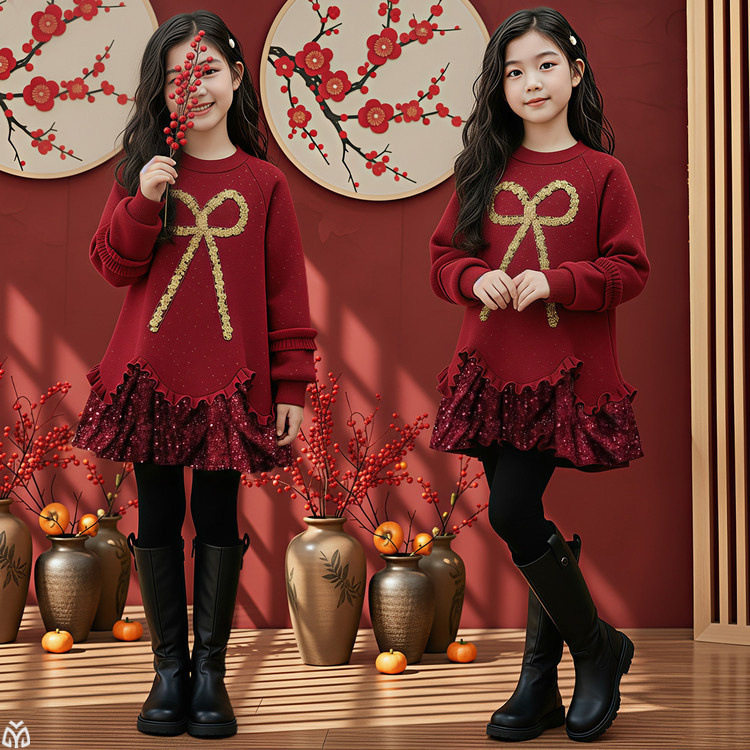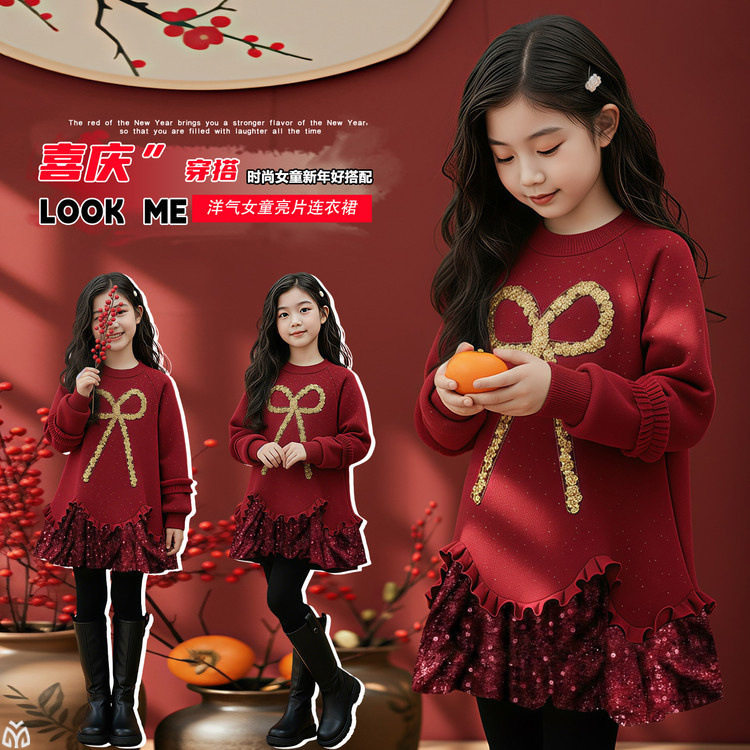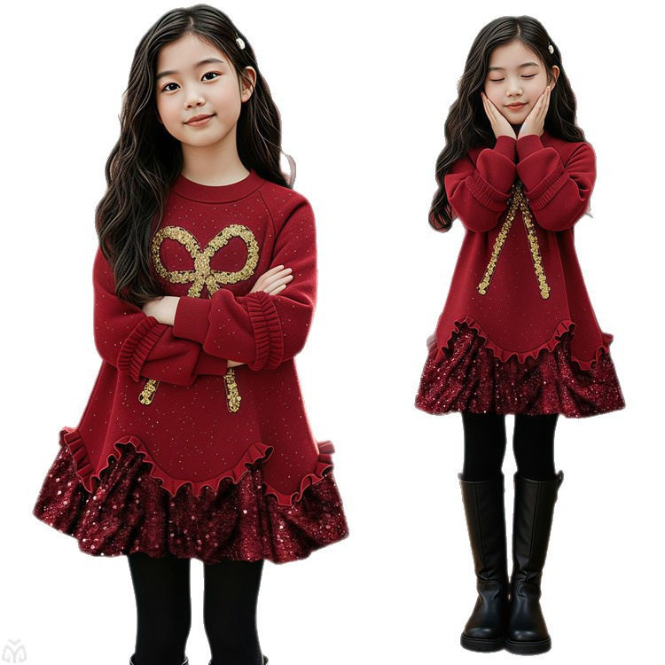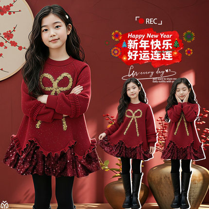 女童加绒亮片裙子儿童连衣裙女孩新款红色卫衣裙女宝洋气过年衣服
