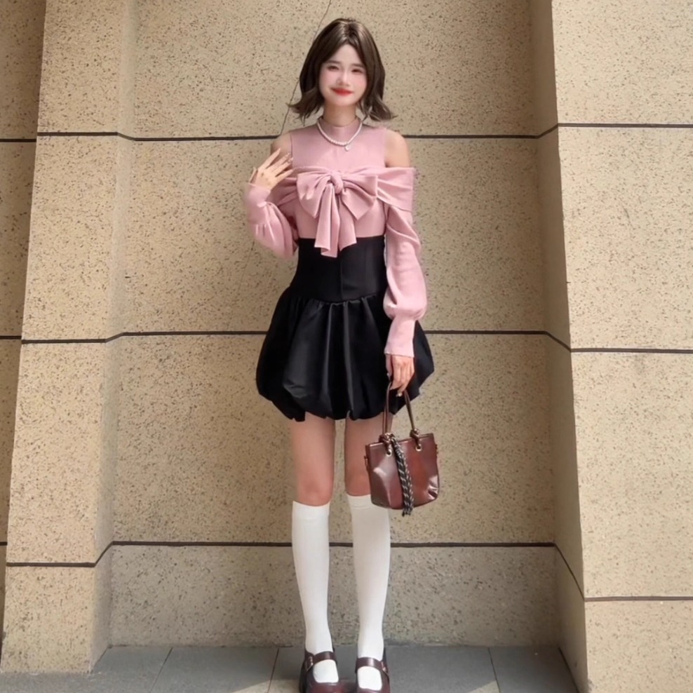 【见习淑女】日系奈奈风甜美套装秋季小众蝴蝶结上衣高腰裙两件套