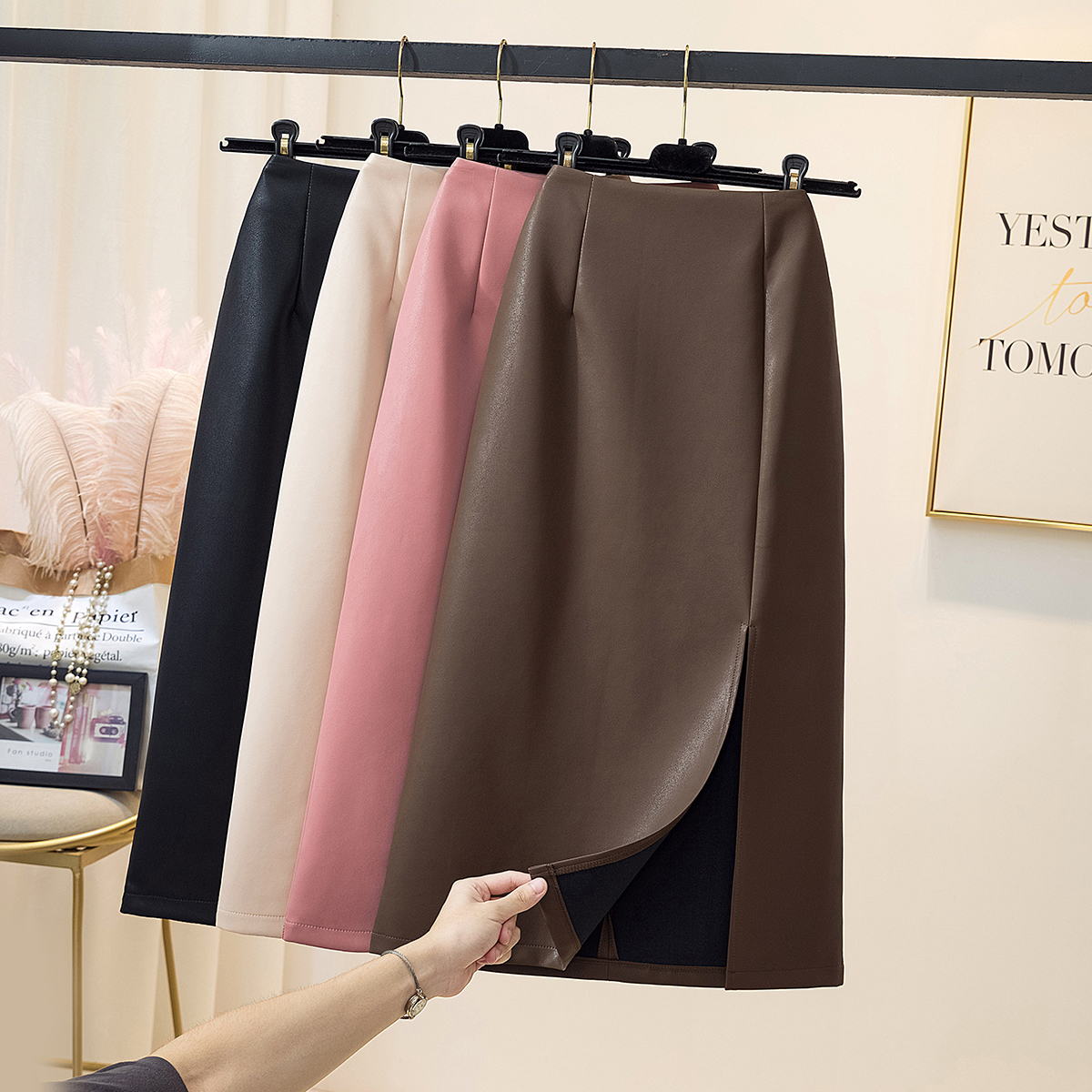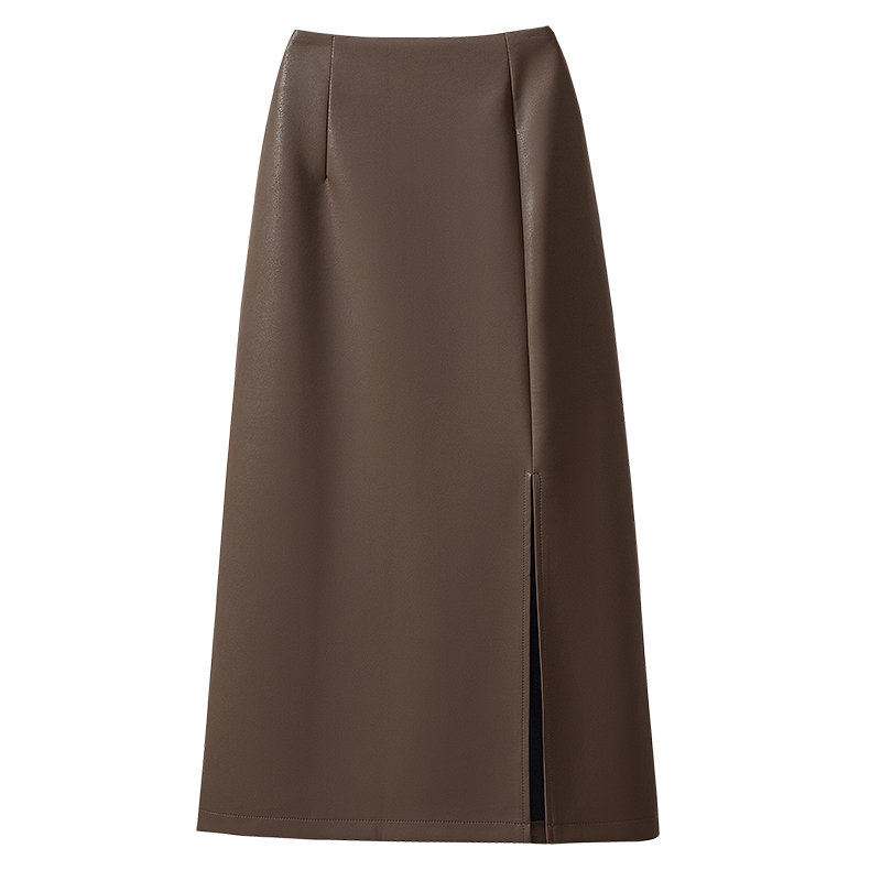 PU皮开叉过膝包臀半身裙女2023秋新款显瘦高腰小个a字中长款裙子
