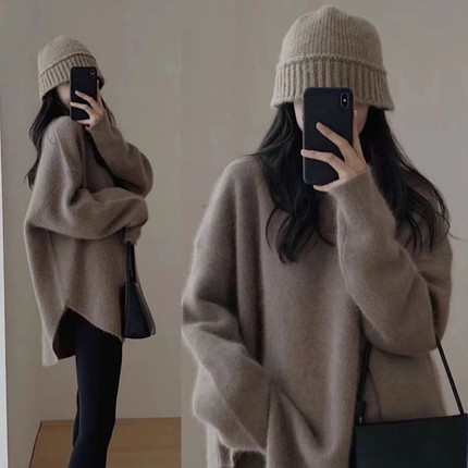 浣熊绒套头毛衣女秋冬外穿中长款日系慵懒复古开叉针织衫冬季加厚